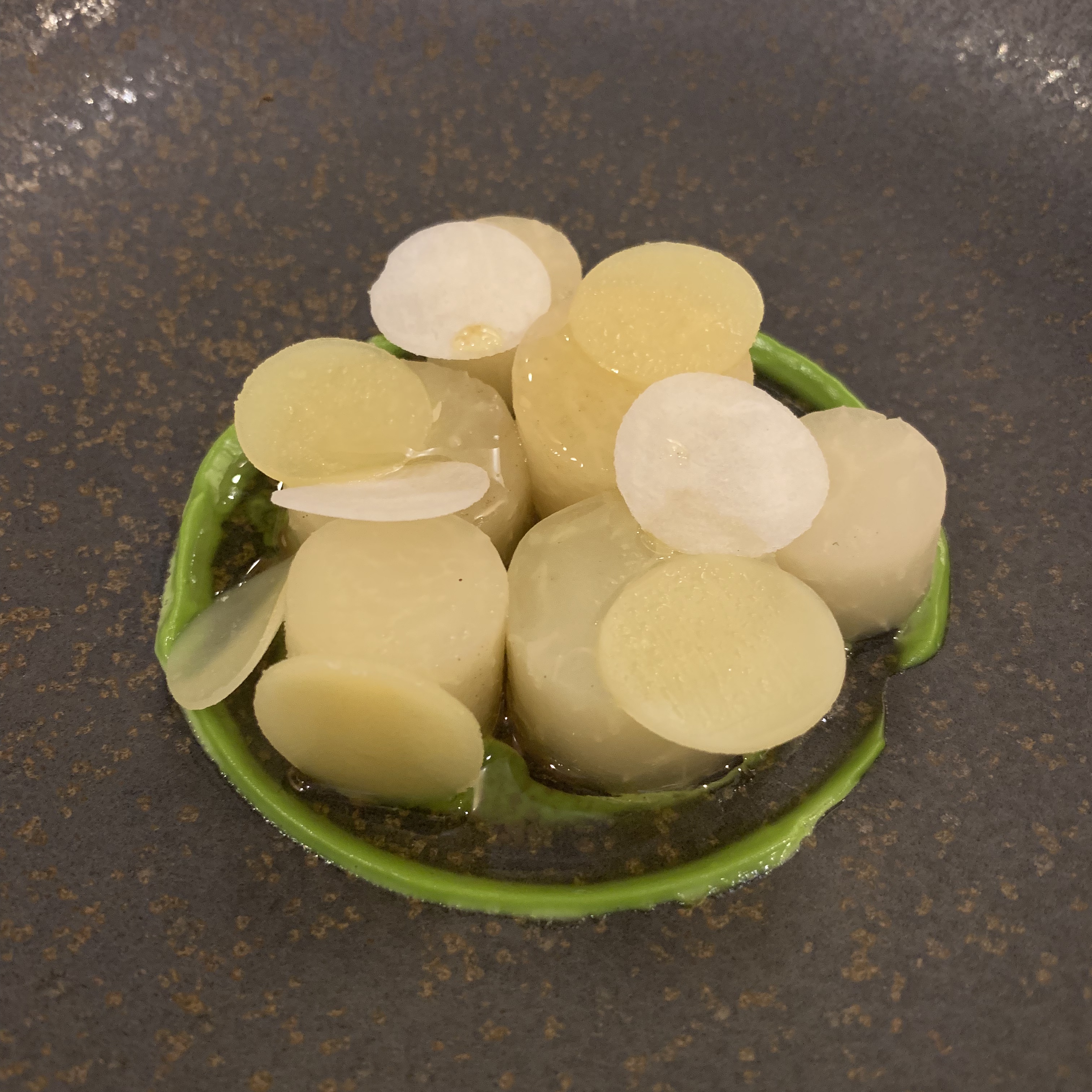 Course 2: A seemingly dull vegetable was transformed into delicious tender cylinders. The kohlrabi was paired with poached turnip, swimming in brown butter, and surrounded by an emulsion of tarragon. The MVP of this dish though was the thin circles of Comté cheese. The combination of kohlrabi and Comté transfixed my tastebuds.