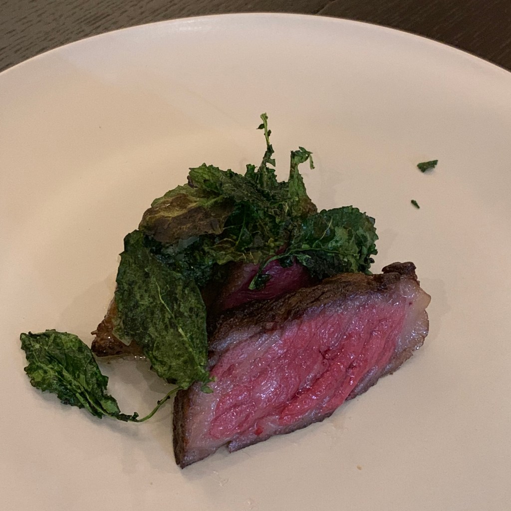 Course 4: The meat dish was delicious A5 Miyazaki beef with sunchokes, grilled kale, and a salsa verde. It was accompanied by grilled dinner rolls with the airiest butter.