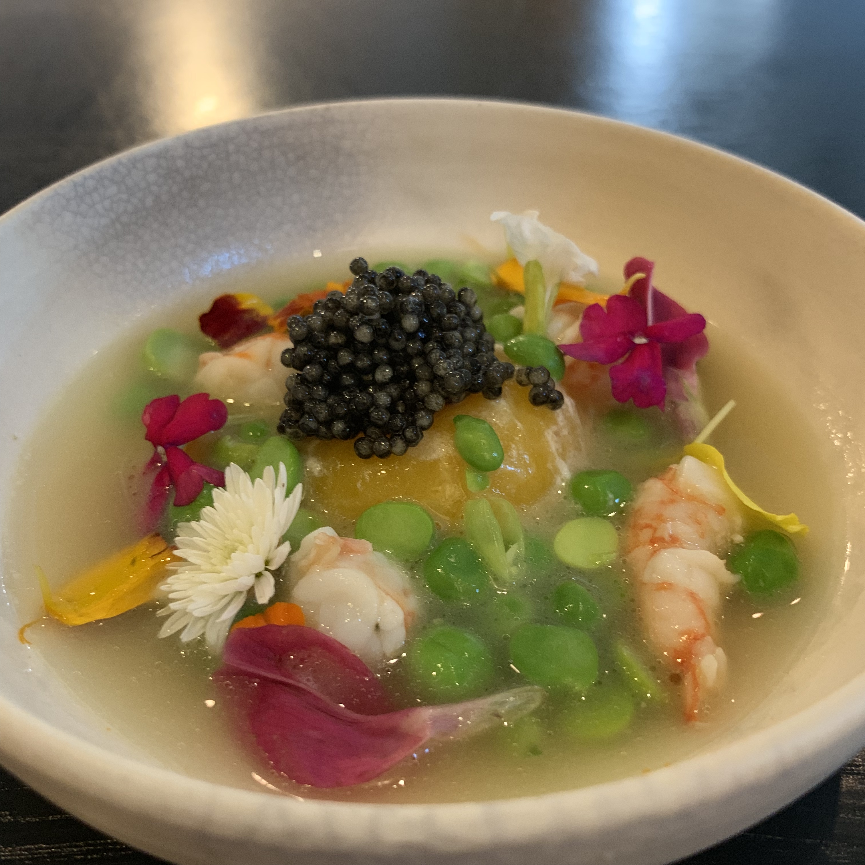 Course 1: Tender English peas with delicious shrimp sat in a savory broth brewed from grilled chicken. The egg yolk and smoked butter added rich notes to this soup that could double as a complete meal. The course was finished with caviar for a touch of luxury and sophistication.
