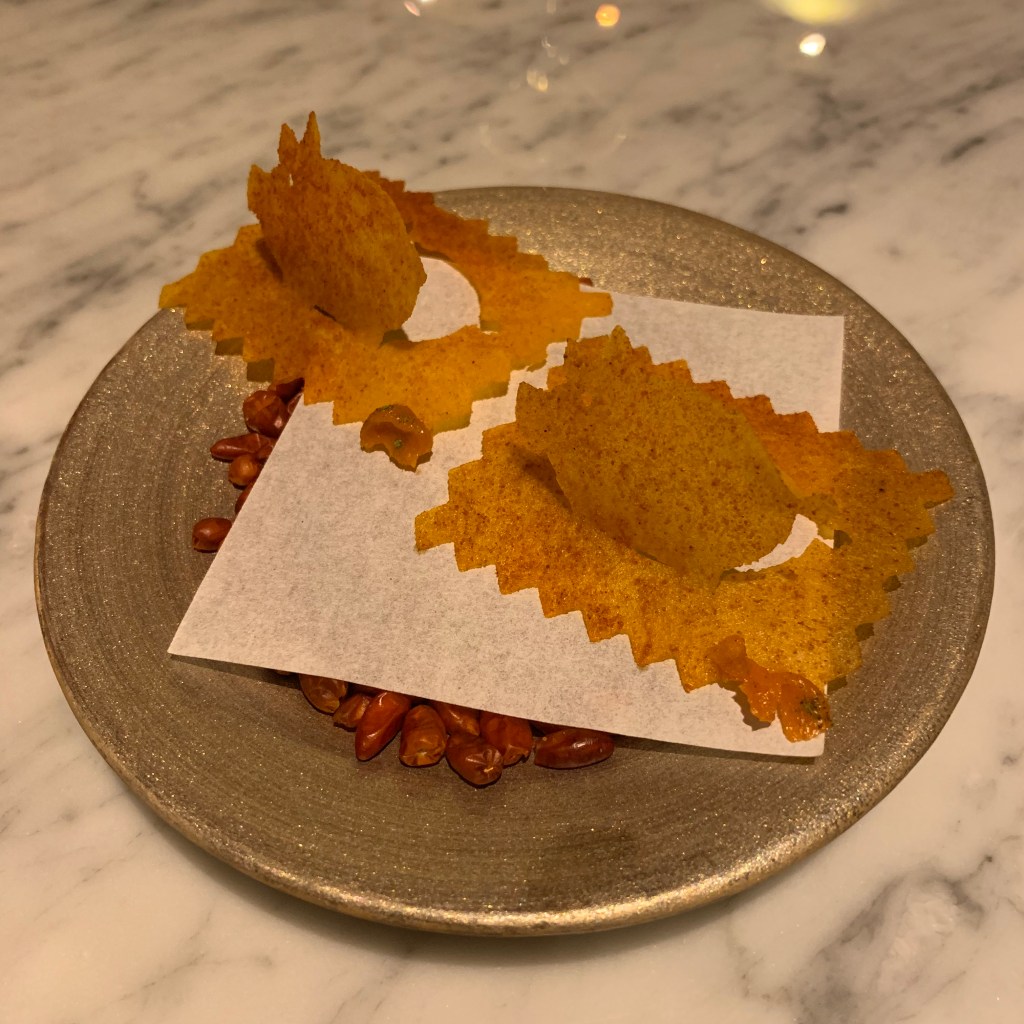 Course 1: A solid “cocktail” made with sweet corn and infused with the flavors of habanero and tequila. A terrific riff on the traditional appetizer often found in Mexican restaurants.