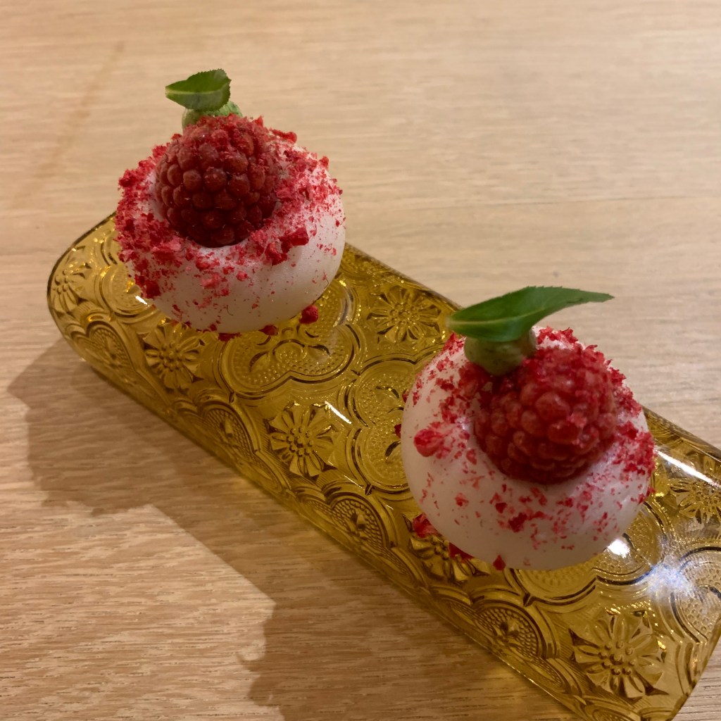 Course 23: The “bomb” was made from meringue filled with cream and covered with freeze-dried strawberry and blueberry. It was both rich and fruity.