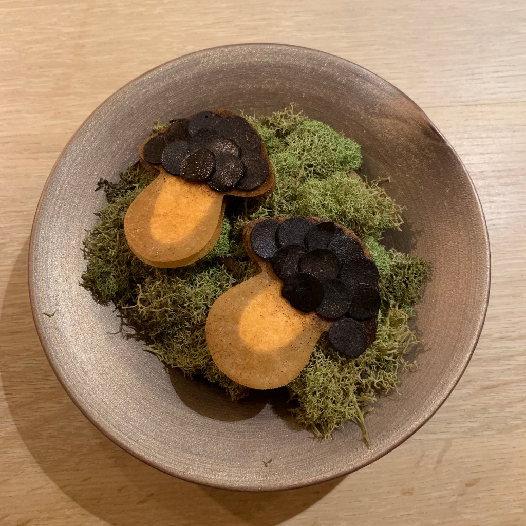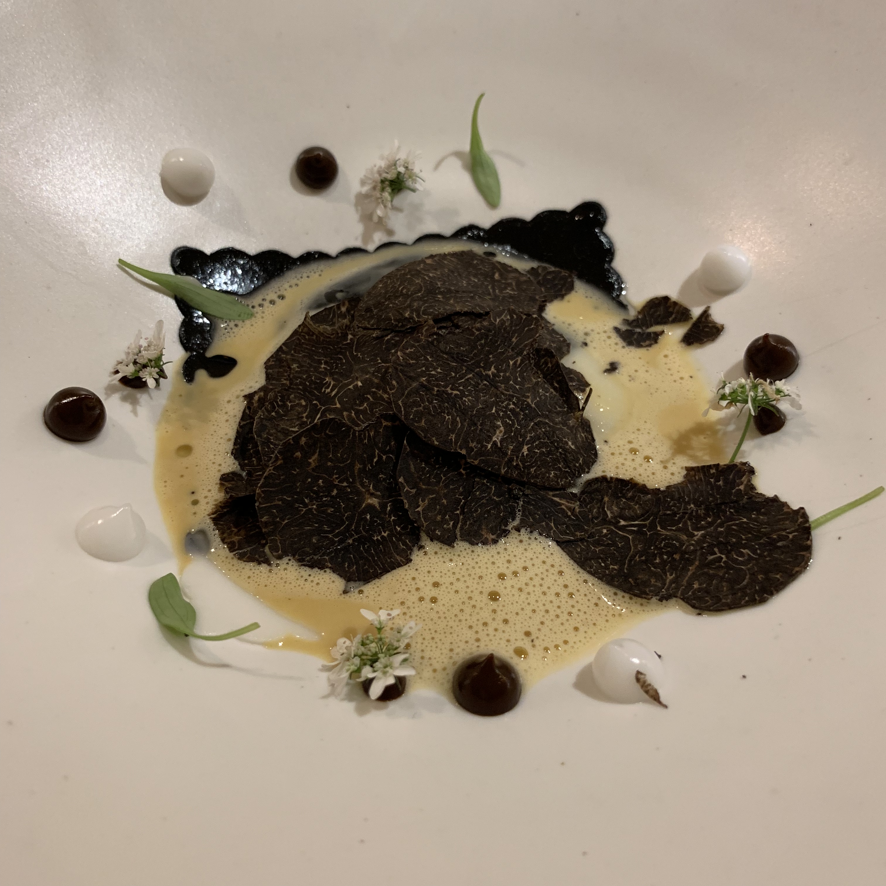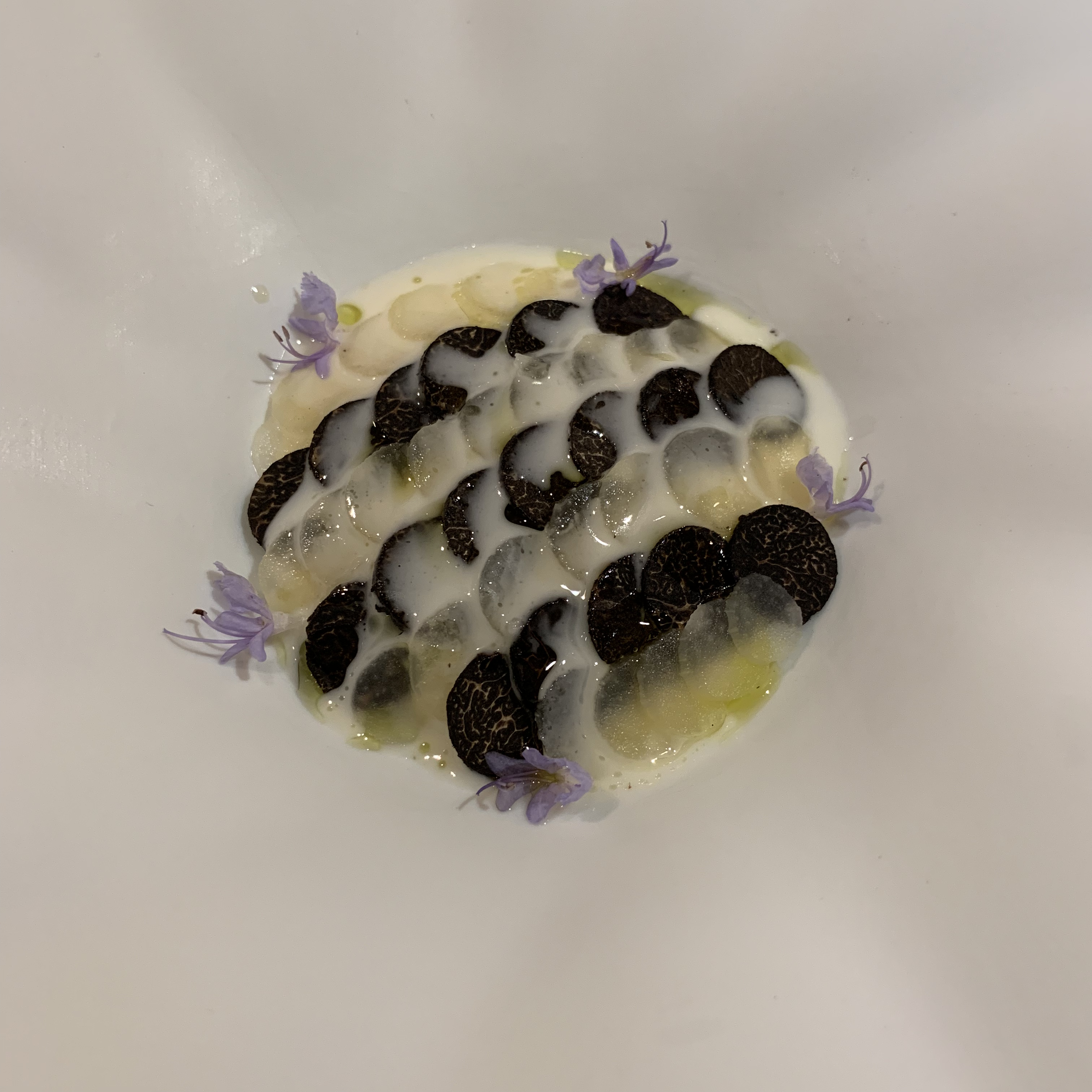 Course 13: Little coins of white asparagus and black truffle were layered side by side on top of a white asparagus puree. It was a delicate balance between subtle and earthy flavors on top of a creamy texture.