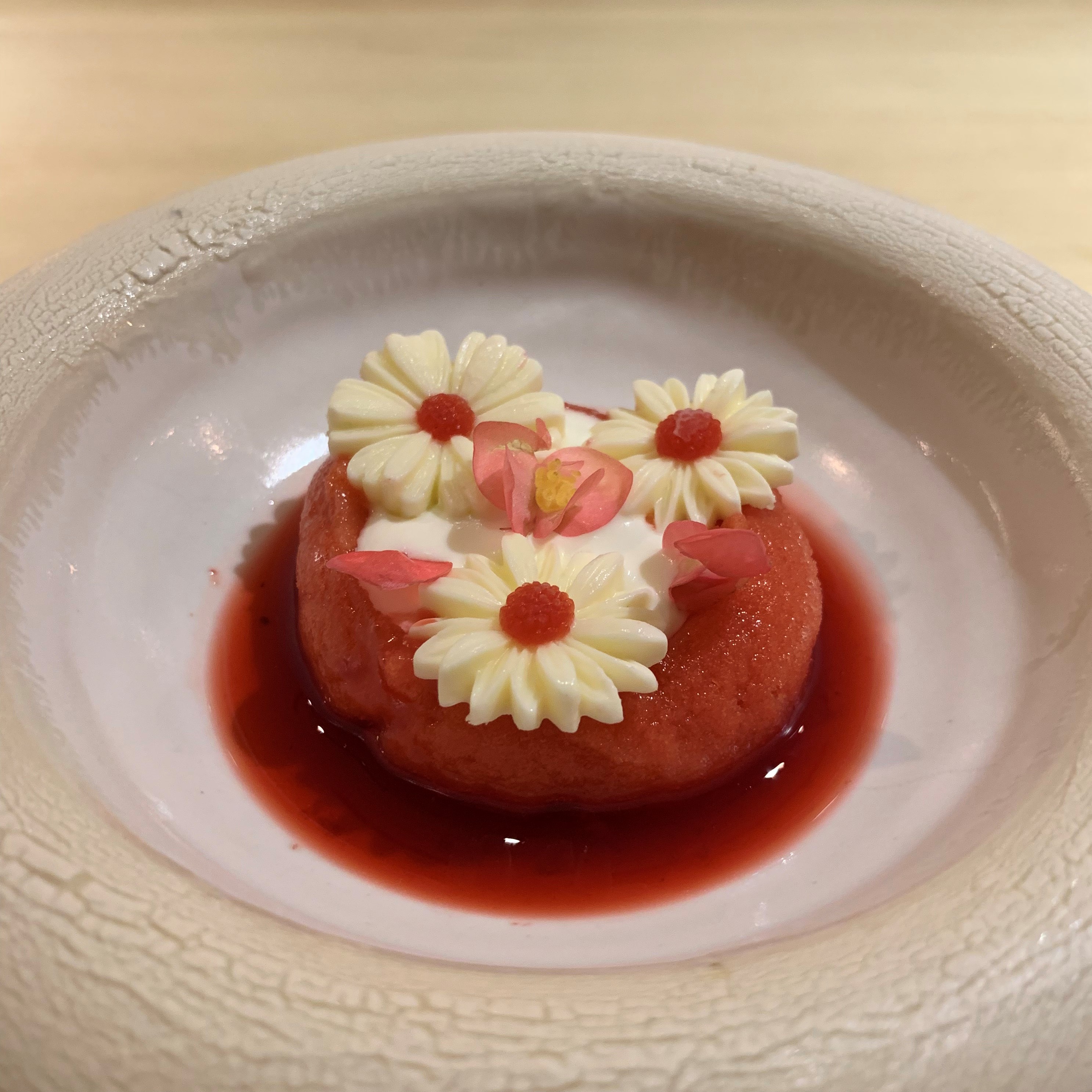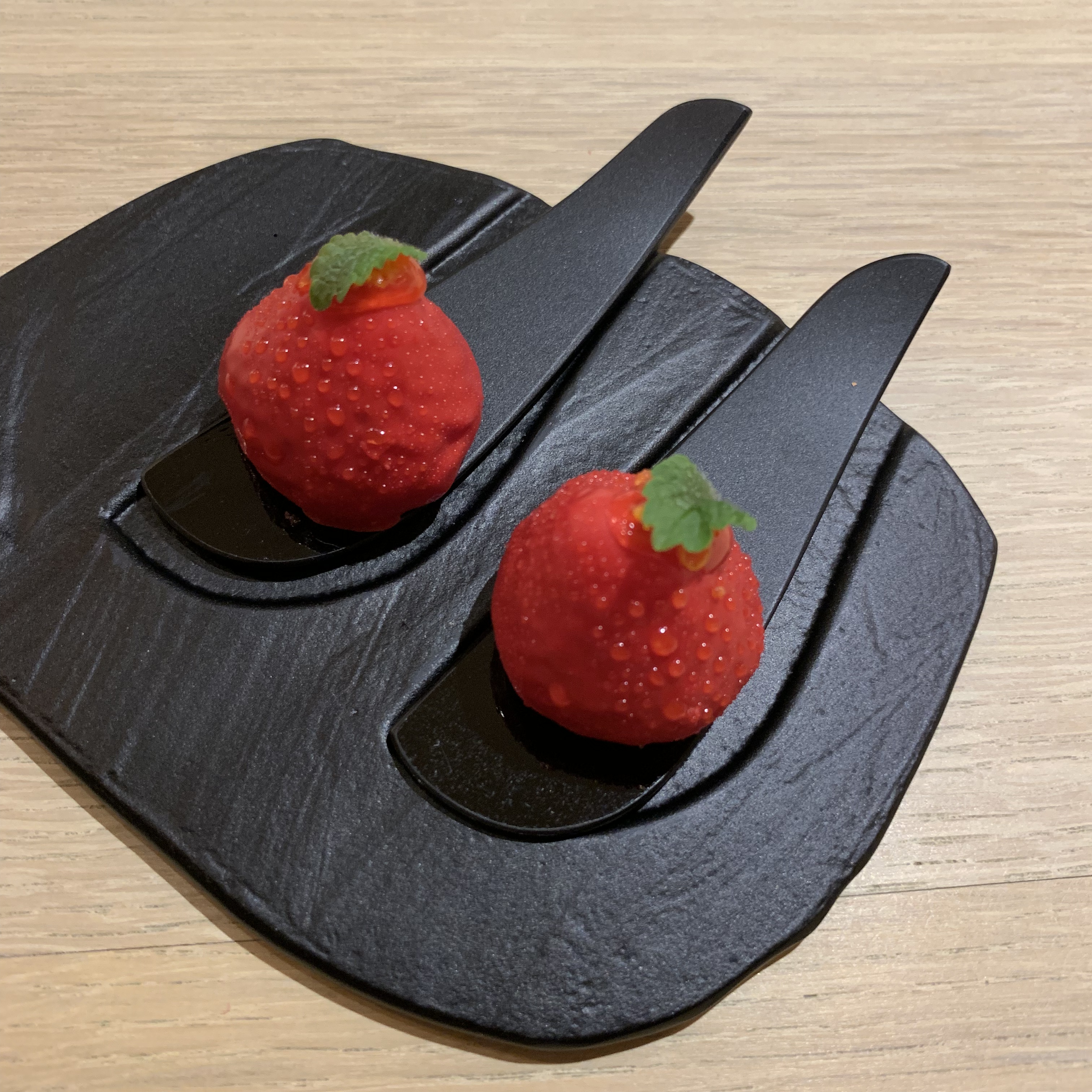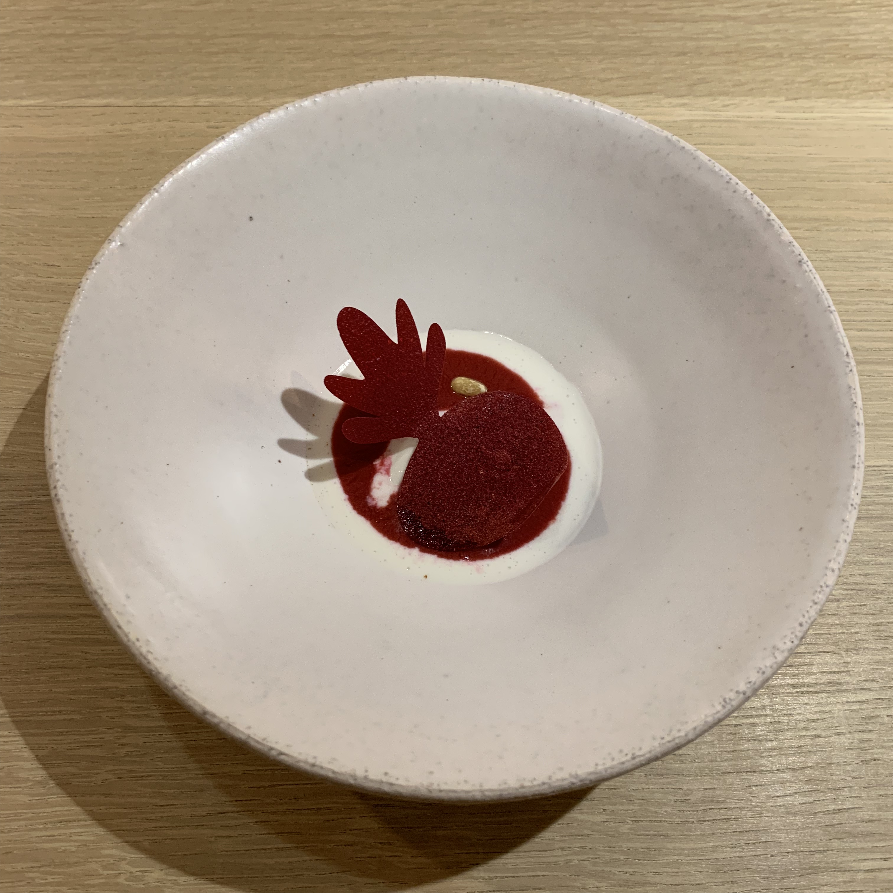 Course 21: Translated as “strawberries and cream”, the dish contained a strawberry ice cream paired with luscious Chantilly cream. It was finished with a pour of chilled strawberry essence. What initially appeared to be a simple dessert turned out to be a stunningly delicious treat with such a pure, almost overwhelming, flavor of the strawberry fruit! An astounding ingredient made for a sensational dessert.