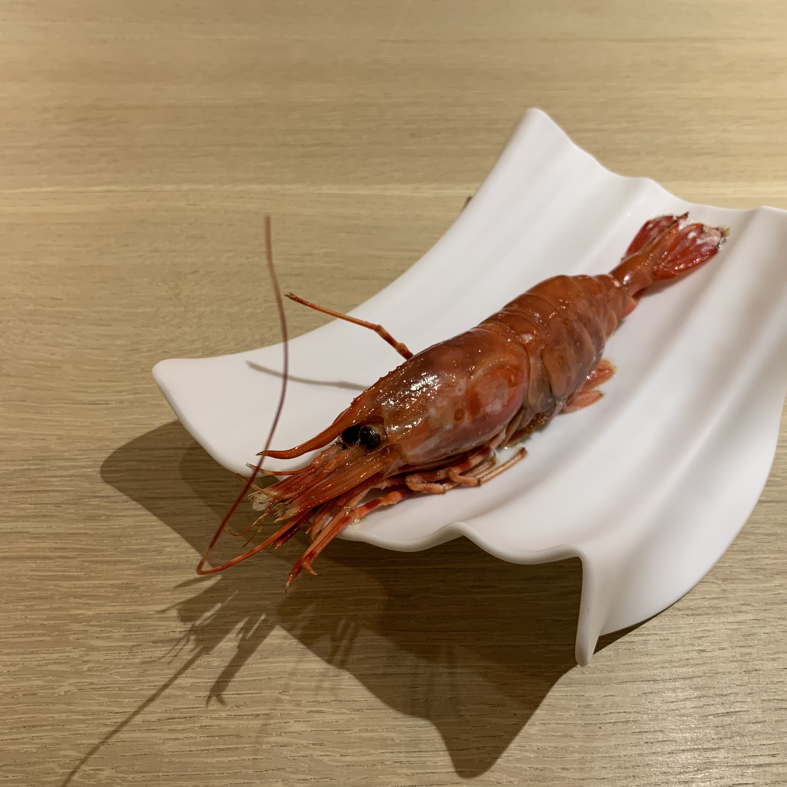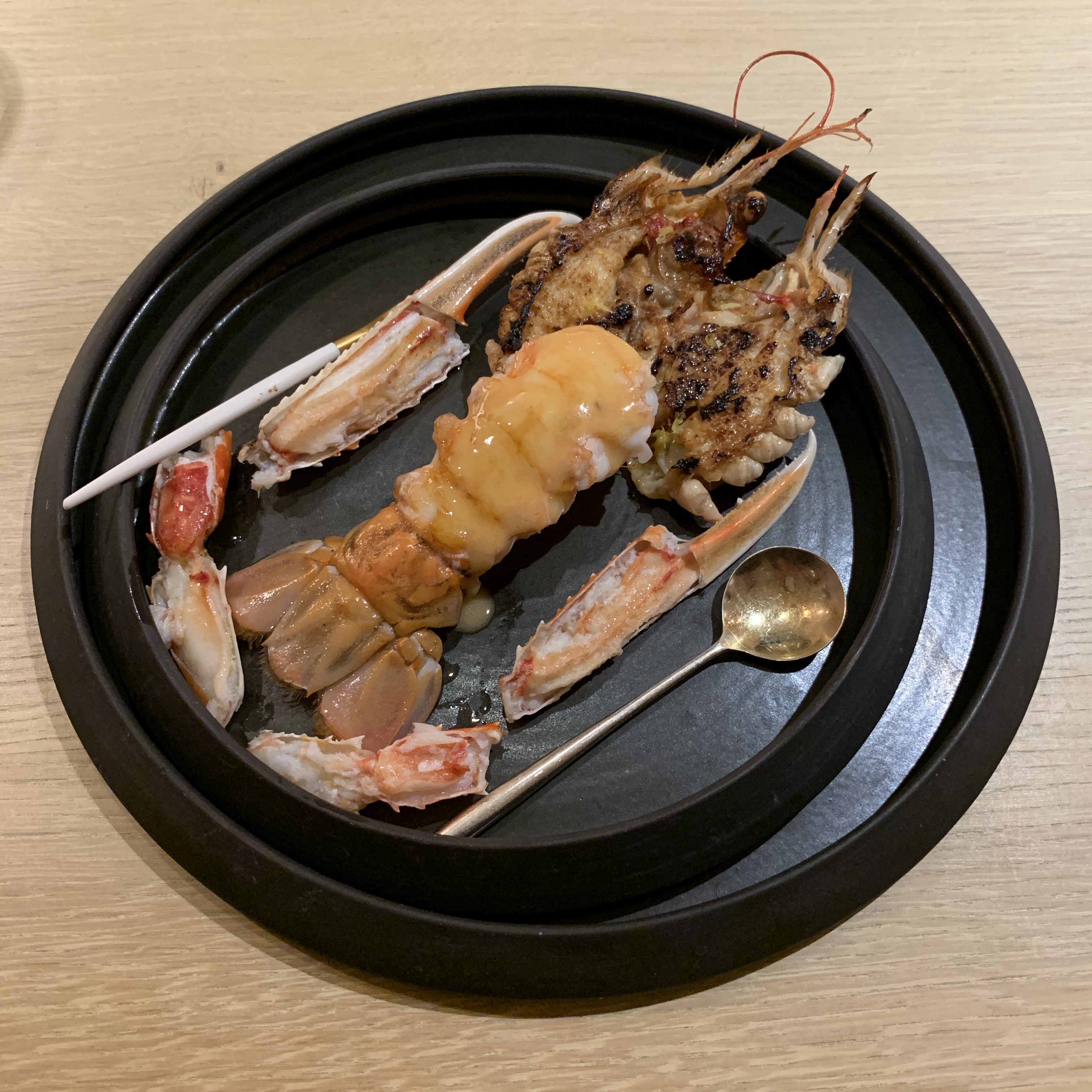 Course 8: We were instructed to tear the prawn’s head off using a twisting motion and then to drink the juices from the head as a start. We would then remove the remainder of the exoskeleton to get at the body. Biting into the flesh, I was stunned by the delicious sweetness of the meat which contained an oceanic note reminiscent of its former environment. I devoured the prawn in seconds and wanted more. Still enthralled, I extracted the brain and every remaining bit of nourishment I could find inside the carapace. This prawn was the exemplar of how a spectacular product, by its innate qualities and characteristics, can elevate dining with little or no alteration. This course was one of my favorites of the evening.