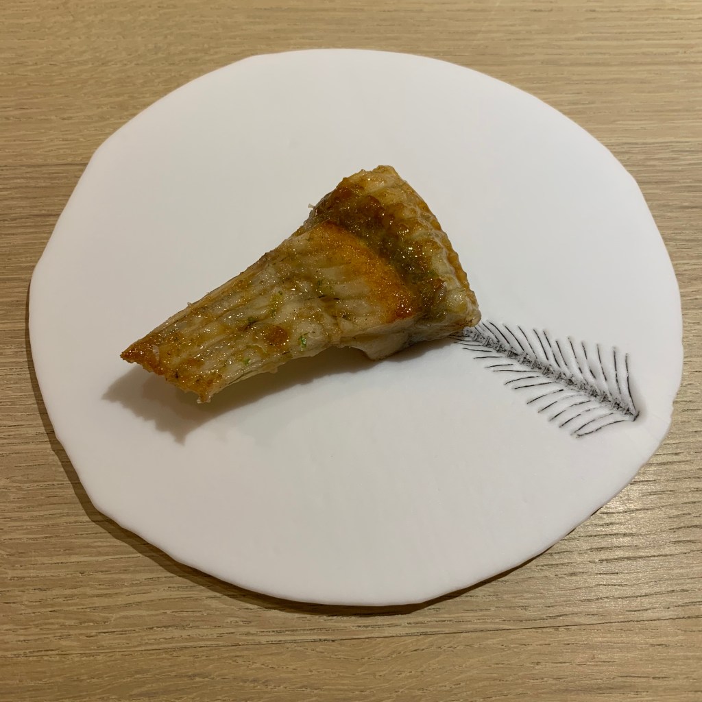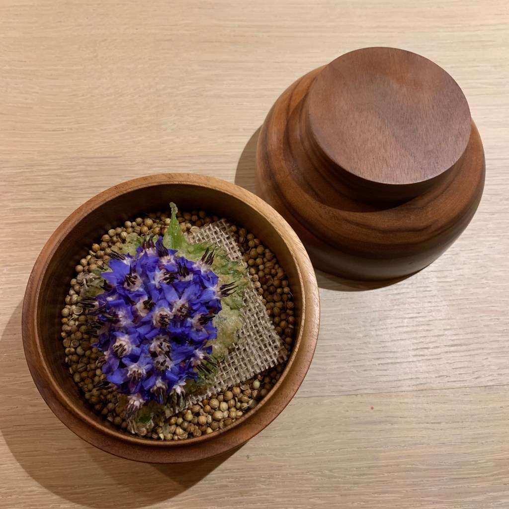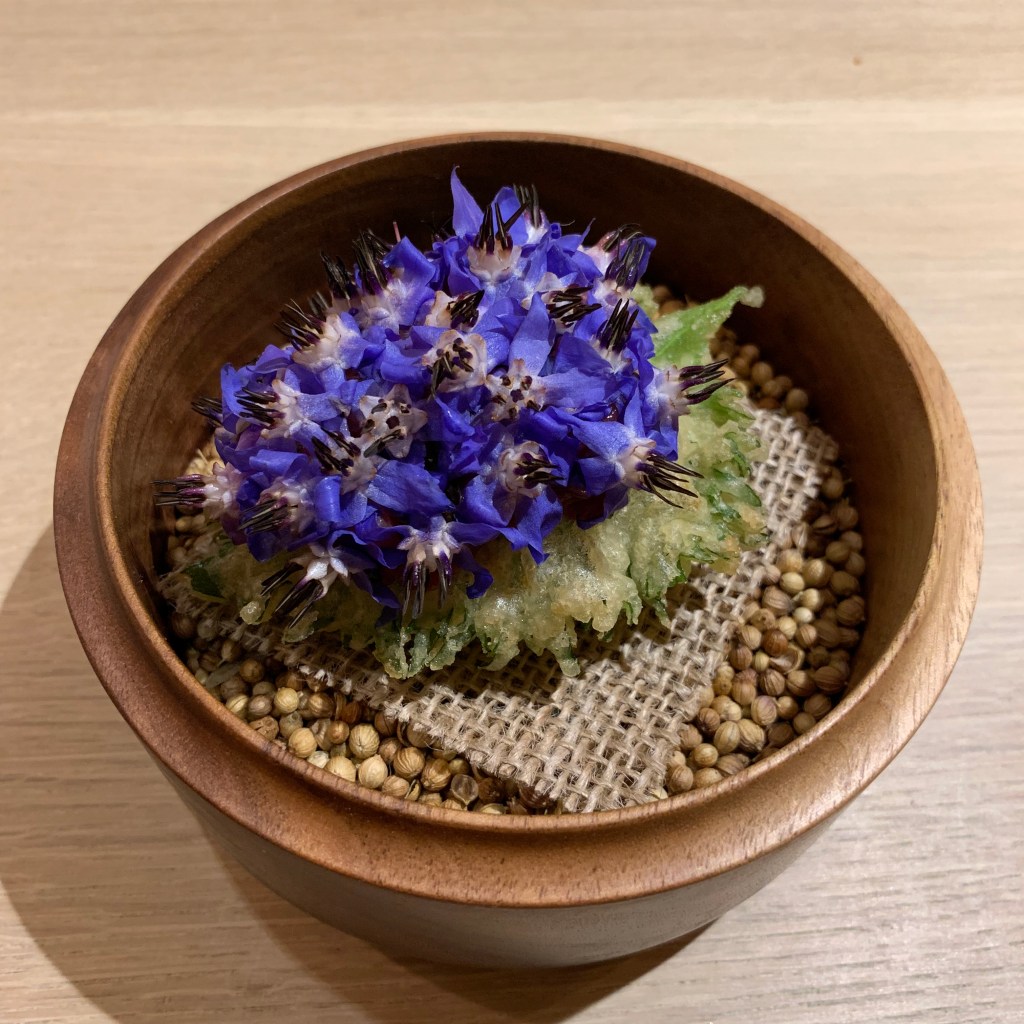Course 9: A tempura puff shiso leaf was topped with dry-aged striploin tartare and covered in beautiful borage flowers. This was a really delicate, delicious bite that showcased wonderful technique and execution. The deep-fried leaf was excellent without tasting greasy.