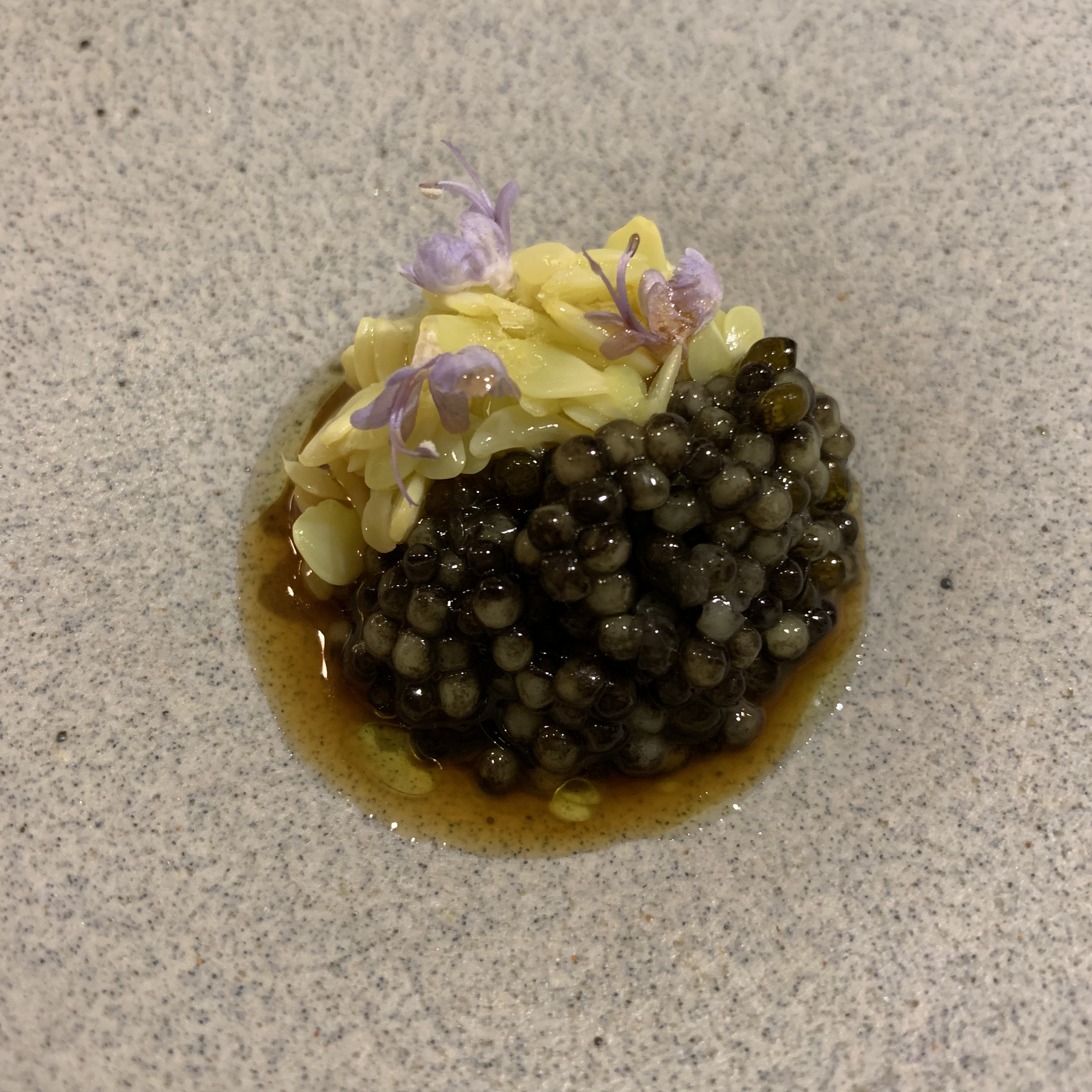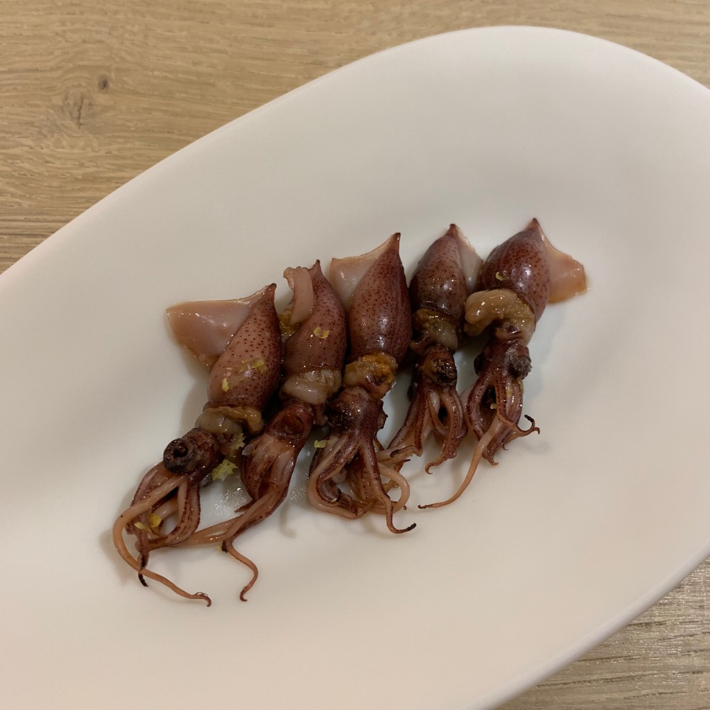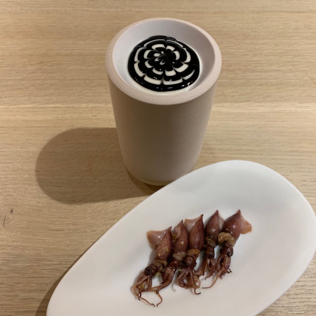 Course 16: Japanese firefly squid were paired with a traditional Basque pil-pil sauce. The black portion of the sauce was made from squid ink. The flavor of the squid was so pristine that the sauce became superfluous. I alternated between eating them plain and dipping them in the pil-pil to experience the beauty of an unadulterated product as well as the way Somni intended the course to be eaten.