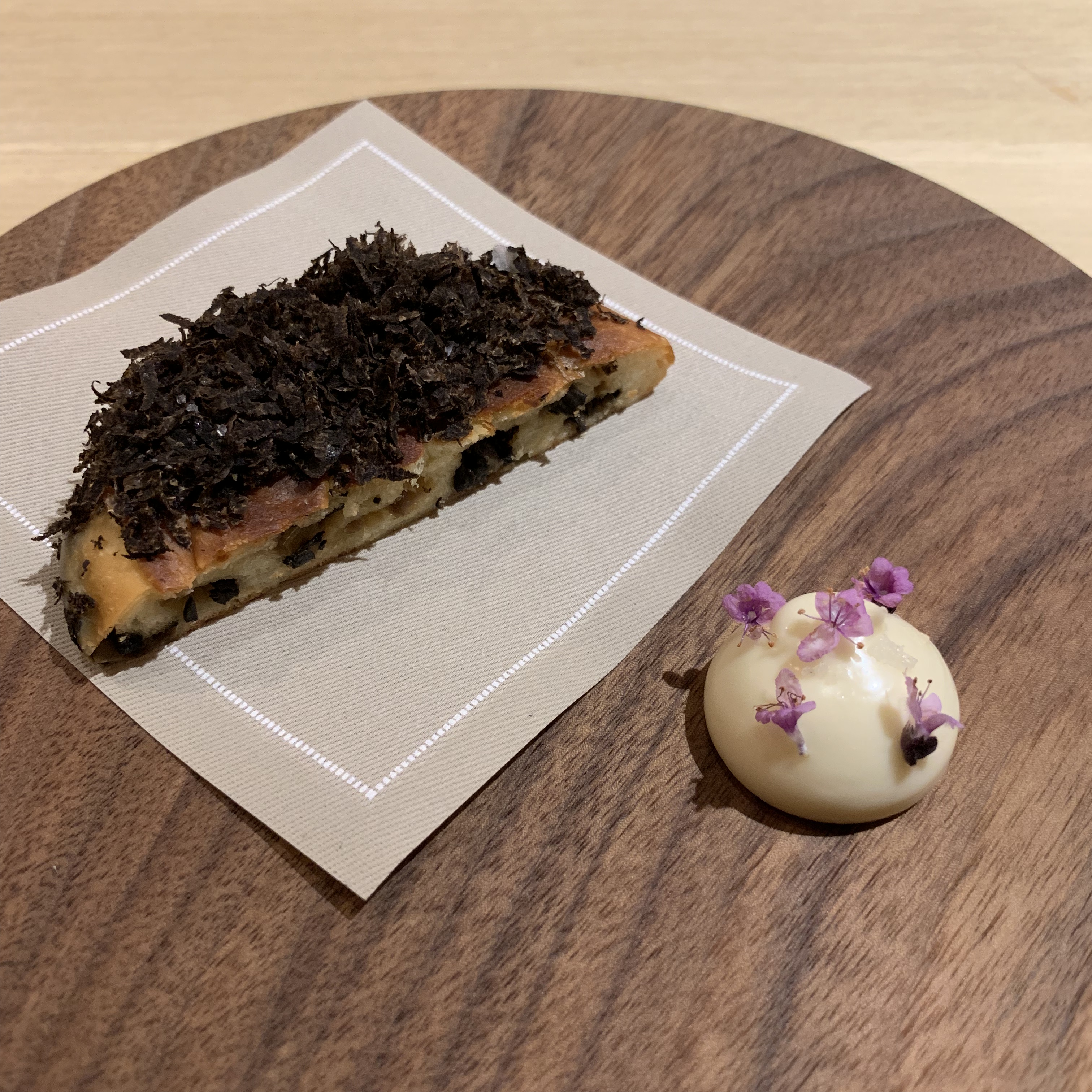 Course 11: Ensaïmada is a sweet pastry from Mallorca. Somni borrowed that idea and reimagined the dessert as a savory brioche, adding in caramelized onions and black trumpet mushrooms. It was served with a dollop of Parmesan butter topped with basil flowers. With the rich butter lathered on top, combined with the earthy aroma from the truffles, this brioche was pure heaven to eat.