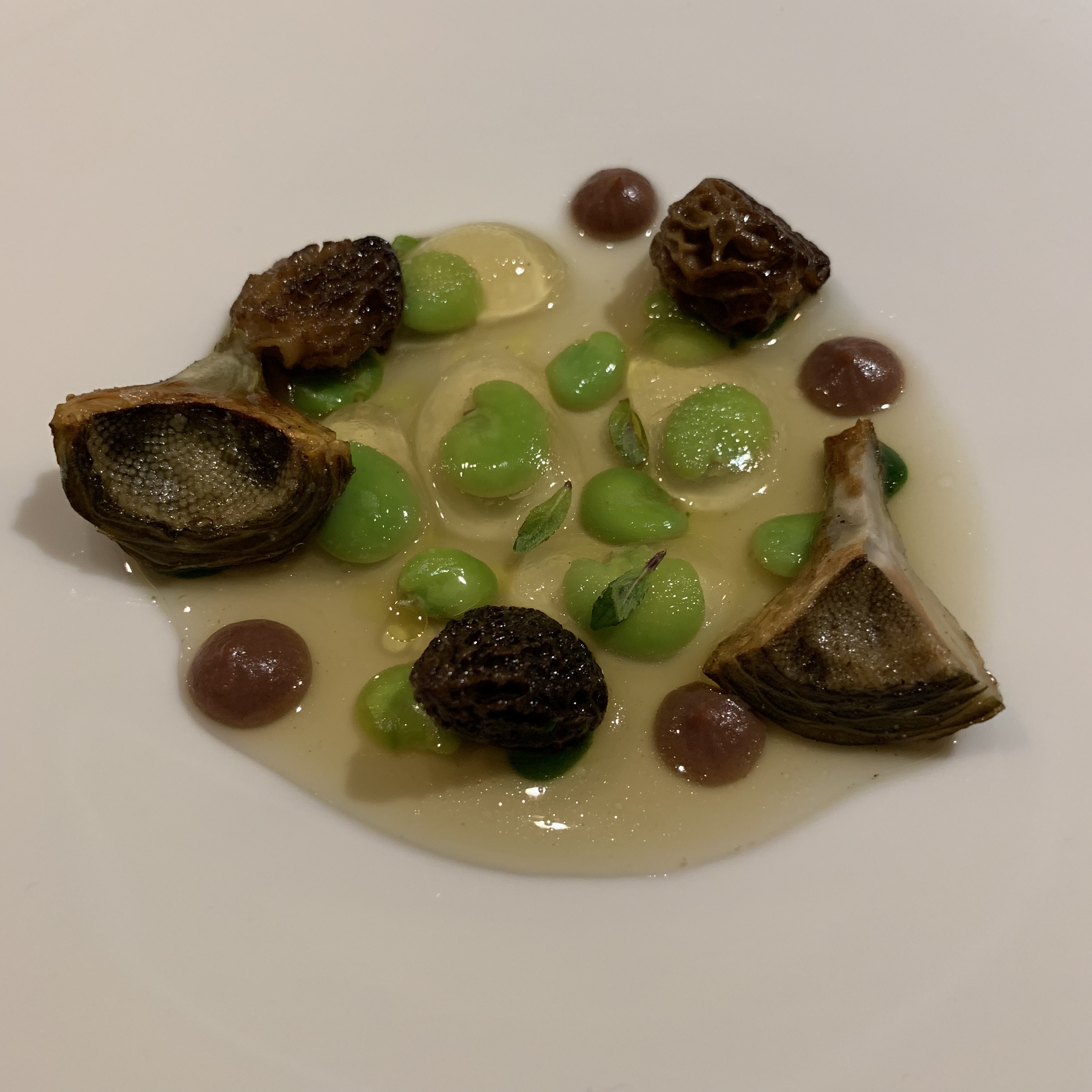 Course 15: The al dente fava beans were cooked in pork stock and served with perfectly sautéed morels and seared artichokes. A vegetable dish that tasted more incredible than it may initially appear to the eyes.