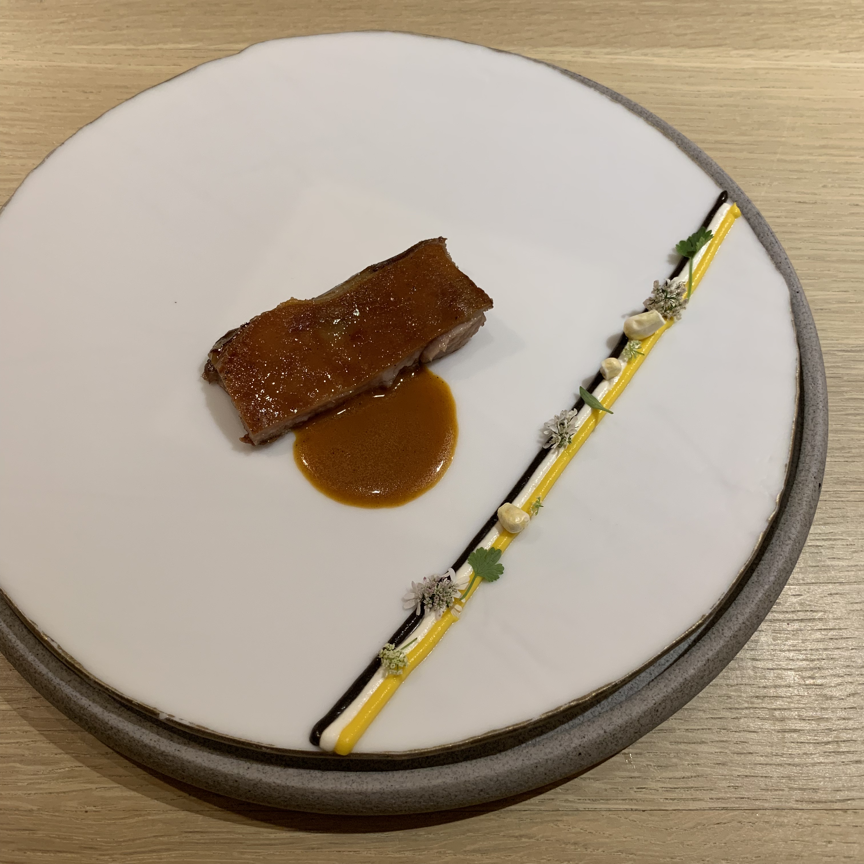 Course 19: The Spanish Ibérico pork was first brined, then sous vide, and finished by searing. It was served with a sauce made from the bones of the pig seasoned with mole. The excellent meat came with a trio of adjacent lines consisting of different purees: butternut squash, huitlacoche, and fresh crema. Freeze-dried corn and some type of flower were placed on top to complete the look of the gorgeous and tasty course.