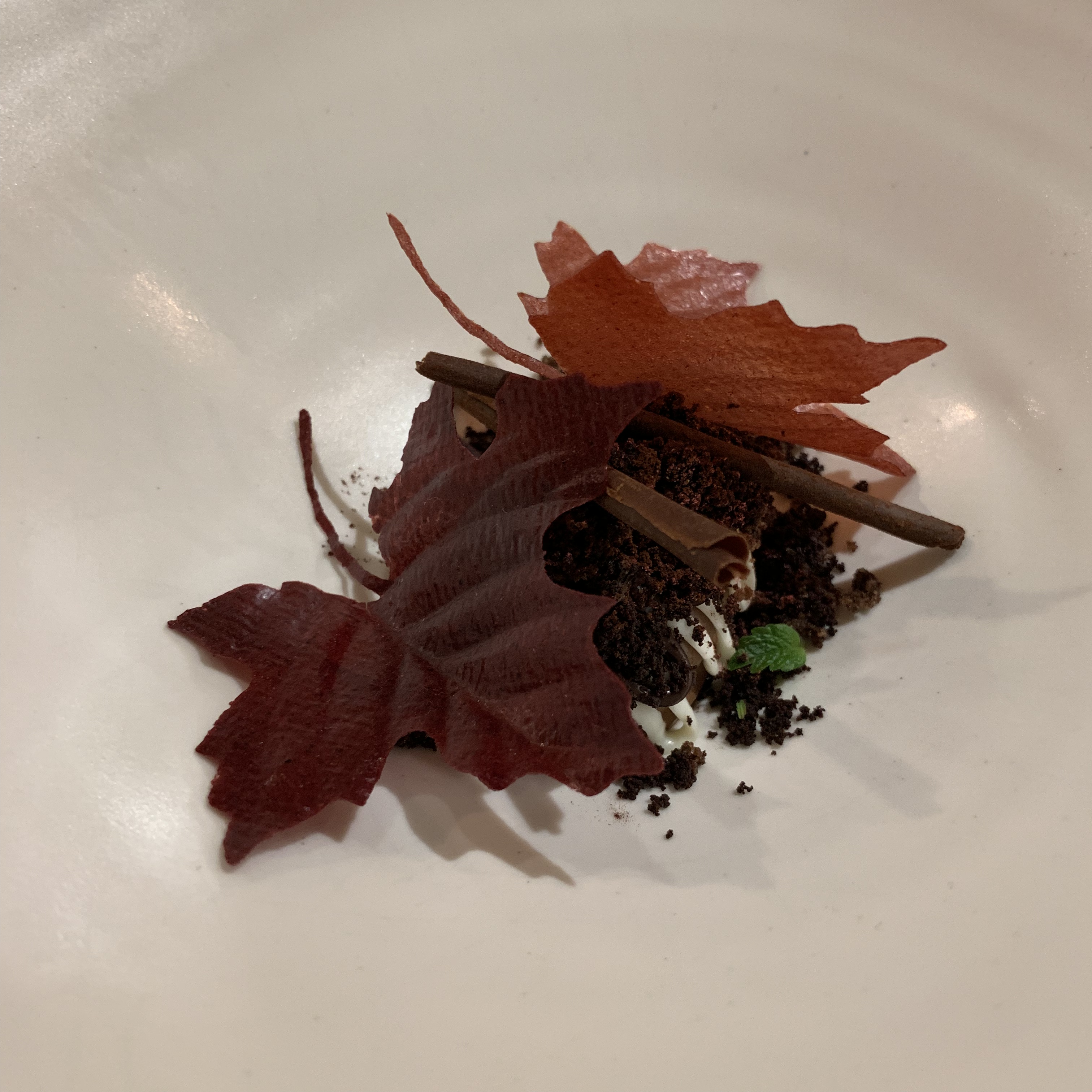 Course 22: The two delicate leaves were made out of raspberry and blackberry, respectively. It was served with a variety of chocolate shapes and textures. It was as yummy as it looked.
