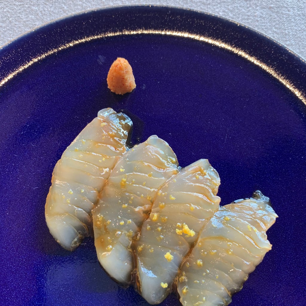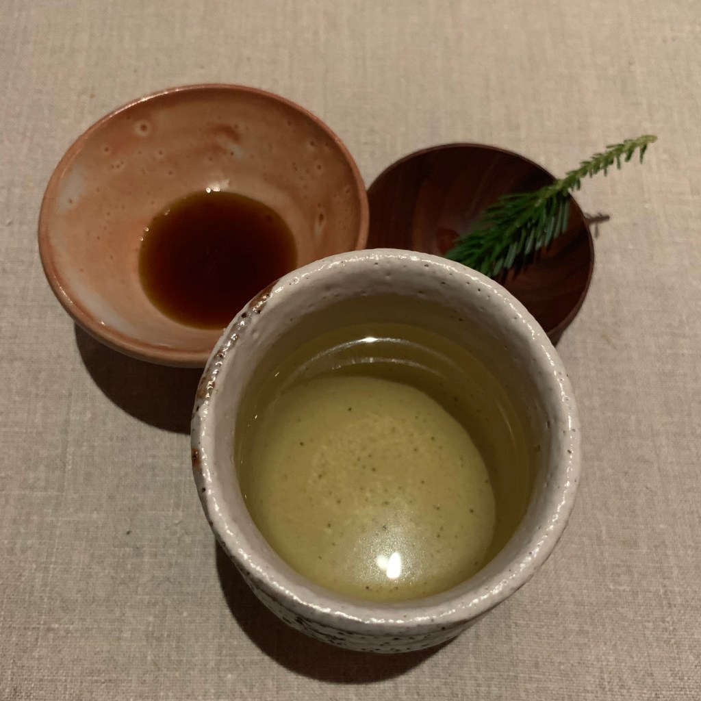 Course 1: Strips of pearlescent flesh cured over seaweed, dressed with cured egg yolk and tamari, and accompanied by a koshu condiment. The amazingly fresh-as-can-be fish was brushed with the just the proper amount of seasoning to enhance its umami.
