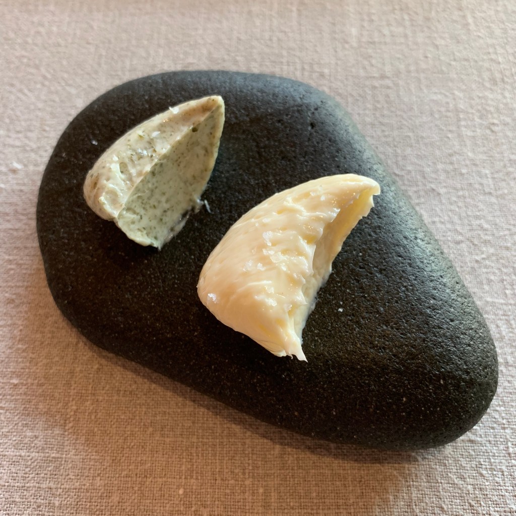 Course 6: Sourdough hearkens back to Chef Matthewβs time in San Francisco. The delicious bread was served with two types of butter. One had been infused with sea lettuce from the cove while the other was sprinkled with sea salt made on premise. The sourdough had a pleasantly crunchy exterior which yielded to a soft interior where mastication was pure pleasure.