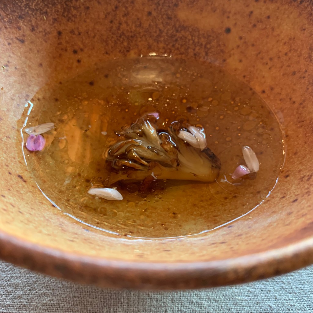 4) pine, yerba buena and marigold tea, grilled honey β the spruce tip, when dipped into the honey, worked as a natural stirrer to sweeten the tea
