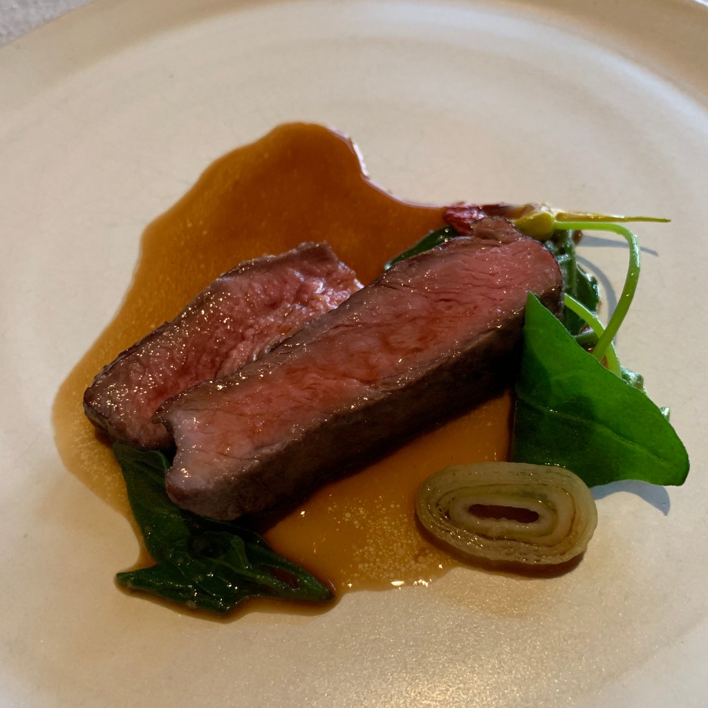 Course 9: Succulent lamb loin smoked over cypress, accompanied by New Zealand spinach, and a jus made from sunflower seeds and porcini.