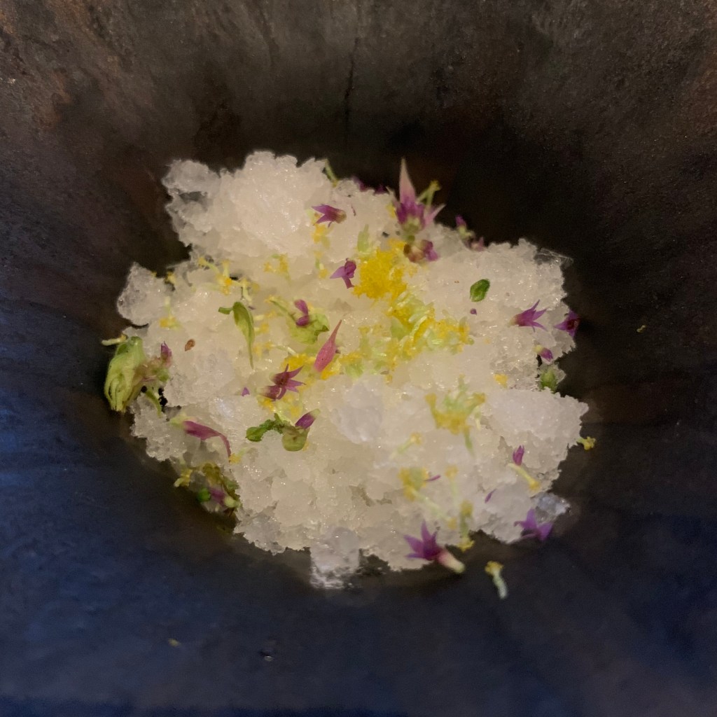 Course 10: Crushed ice made from the unfermented juice of GewΟrztraminer grapes and garnished with floral furnishings from the garden made for a refreshing palate cleanser.
