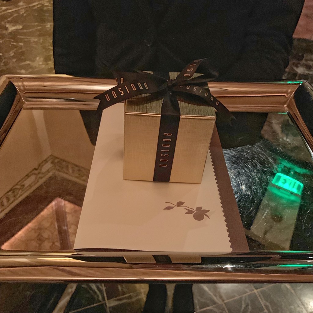 To-Go Gift: A copy of the menu and a box of treats presented on a sparkling tray. Addison retains it elegance to the very end.