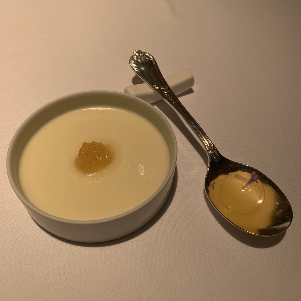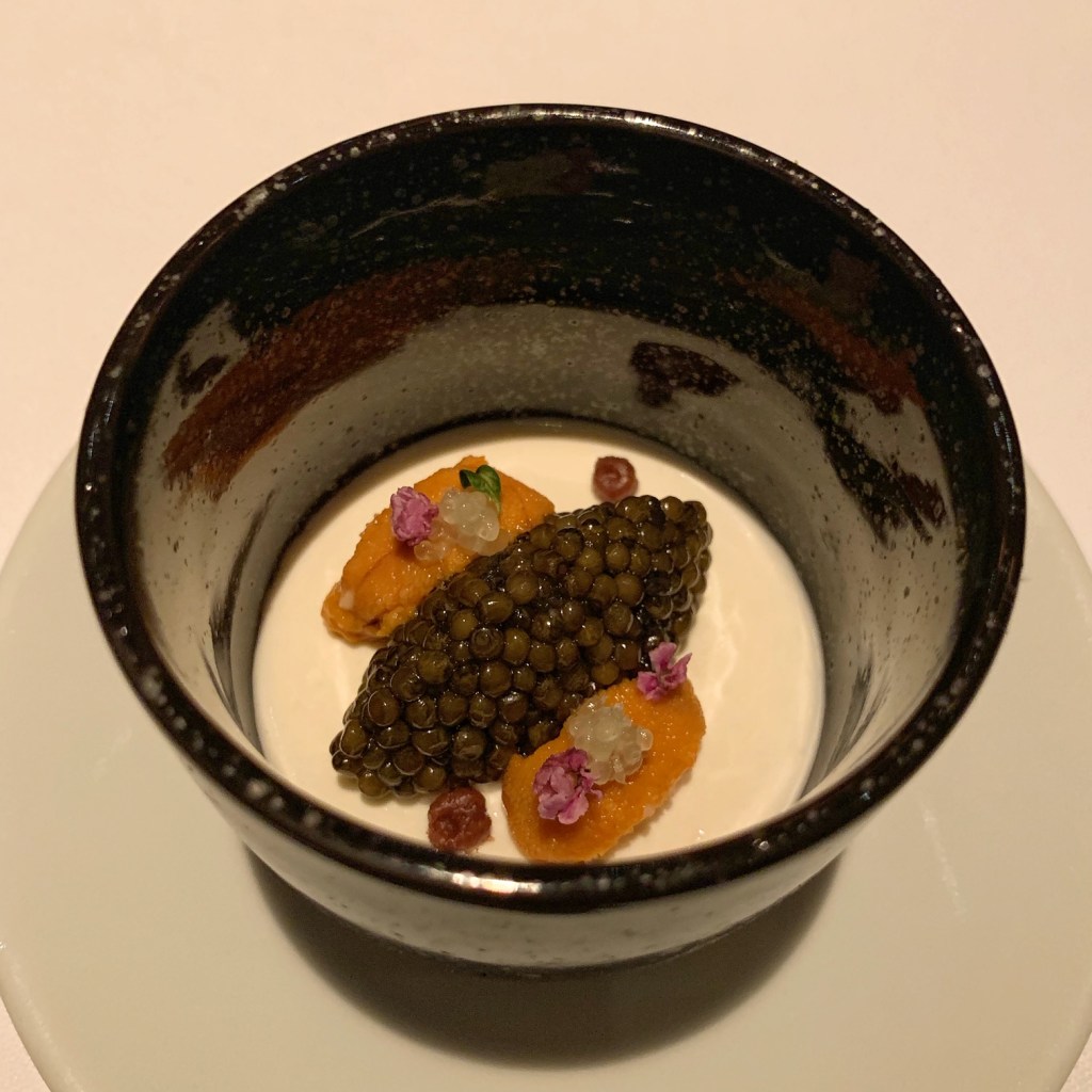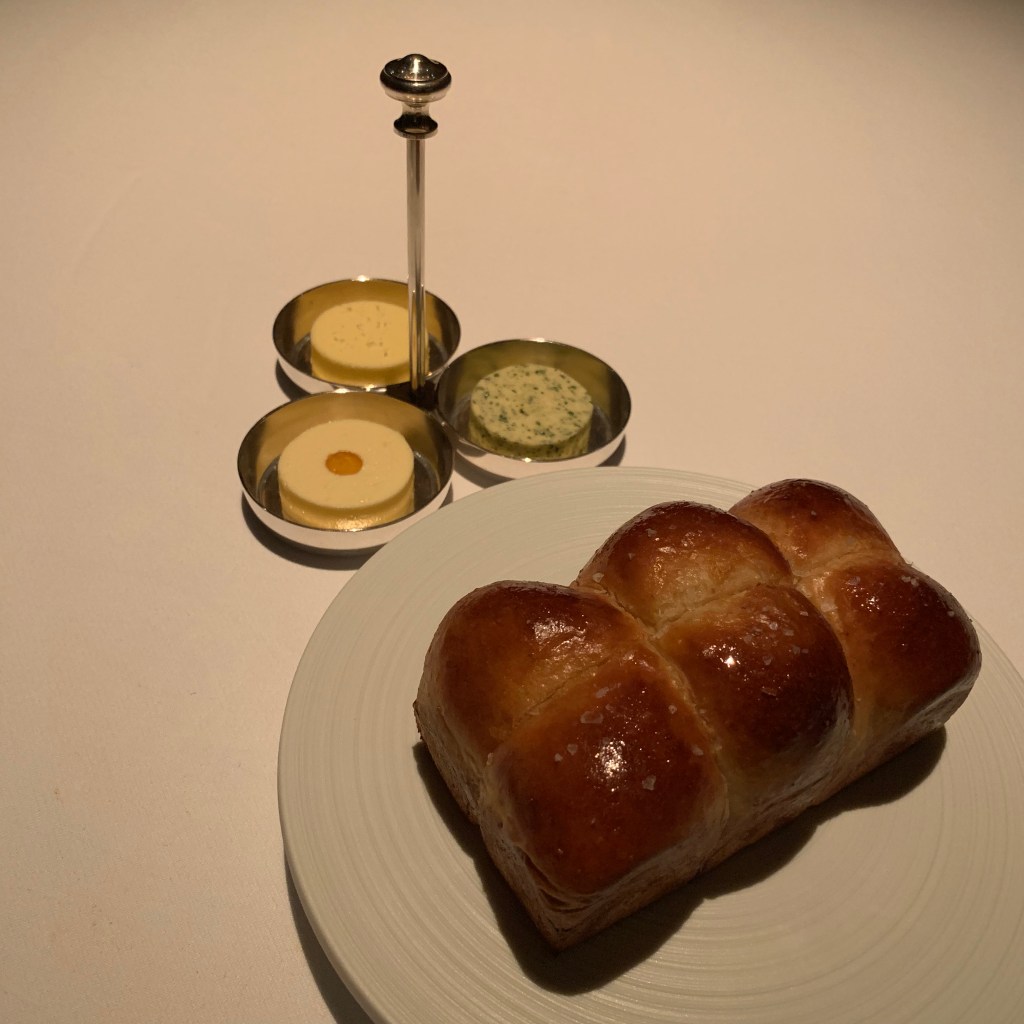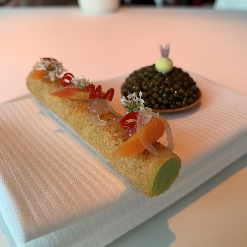A collection of three amazing canapés: 1) a cylinder of feuille de brick stuffed with escabeche with coriander flower and avocado; 2) a tartlet of Kaluga Queen caviar with chive flower and brown butter; and 3) a gougère filled with bacon, aged sherry, and mascarpone. All three snacks were perfectly balanced in seasoning and flavors. These are the kinds of mini courses that make you yearn for one more bite to convince yourself the deliciousness you just consumed was not pure imagination.