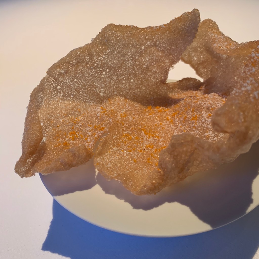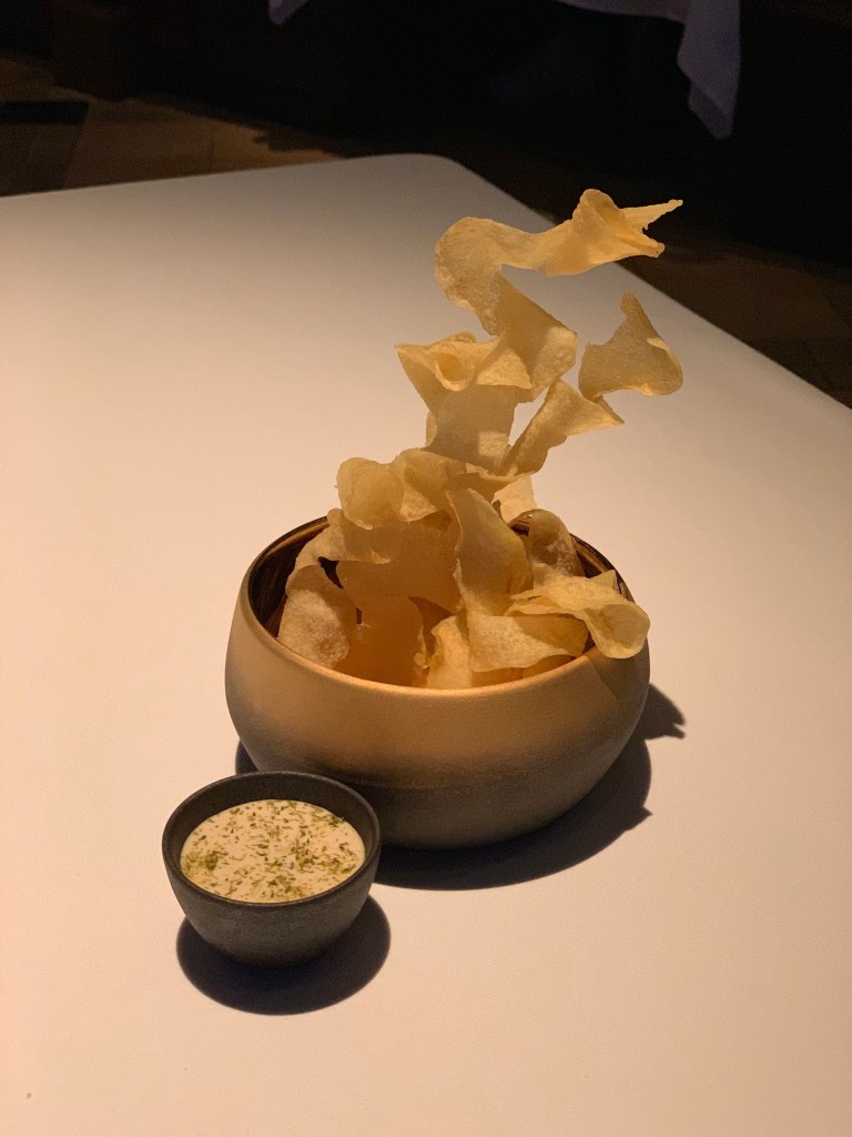Course III: A fine-dining rendition of one of America’s most popular party snacks, chips and dip! Long ribbons of potato, flavored with vinegar and Cabernet, were fried to a delicately light and perfect crisp. They were served with a French onion dip with a perfect ratio of sour cream to minced onion and finished with a dusting of fennel pollen.