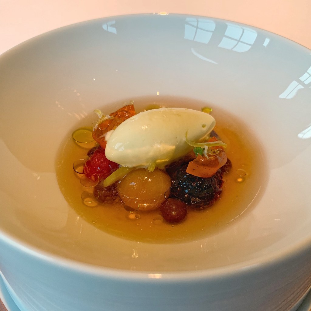 Course I: Translated as “fruits of the earth”, this dish showcased the terrific summer produce available in Southern California. This course featured a medley of wild berries and frozen Champagne grapes submerged in a refreshing consommé concocted from the abundance of flavorful juice of ripe heirloom tomatoes. It was topped with an olive-oil ice cream, creating a balance of rich and acidic flavors as well as contrasting textures.