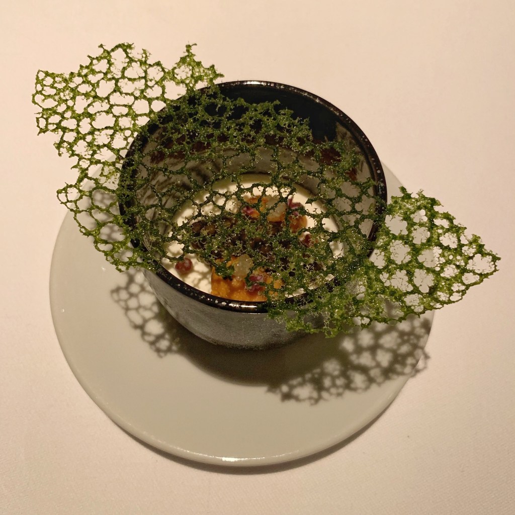Chef Wiliam’s hors d’oeuvre are designed to awaken the palate, whetting the senses for the courses to come. First, a refreshing granité using two fruits, one subtle in flavor and the other imparting a citrusy tang. A delicate yogurt, whipped to an airy elegance, sat on top of the granité and added a pleasing tartness and richness to this bite. A sprinkle of ceremonial green tea completed the look of the course.