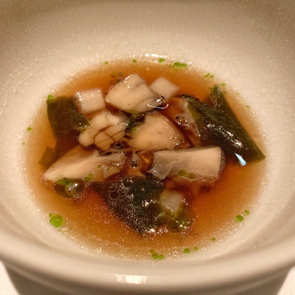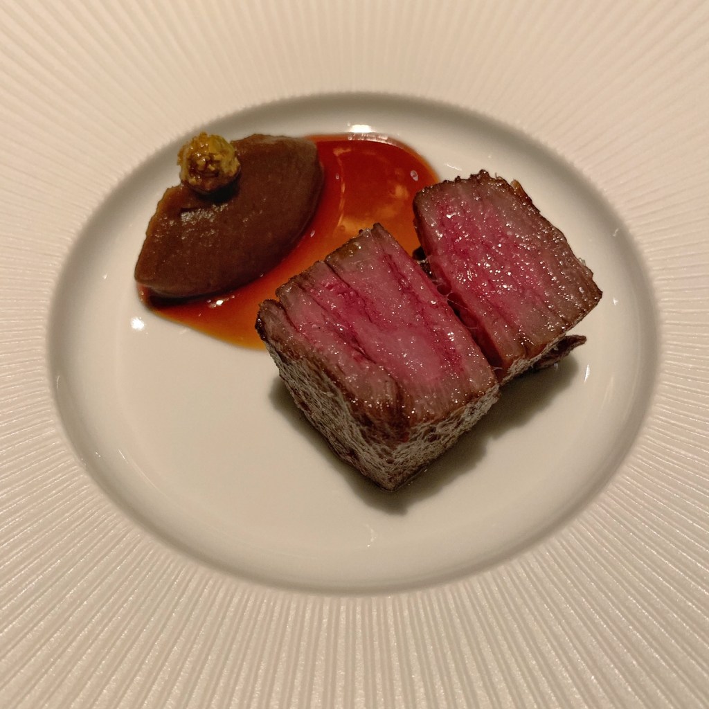Course IX: Often praised by gourmands as the most luxurious beef, this steak with impeccable marbling was cooked to a perfect medium-rare, allowing the intramuscular fat to melt and seep and flavor everything it touched. It was served with an eggplant puree topped with miso and a sauce made from vinegar, soy sauce, and sugar. This course, without the need for false hyperbole, was one of the best preparations of A5 Wagyu I have eaten to date. Meticulous execution here! It arrived accompanied by a bowl of maitake mushrooms immersed in a savory beef broth supplemented by its own earthy juices. Delectable!