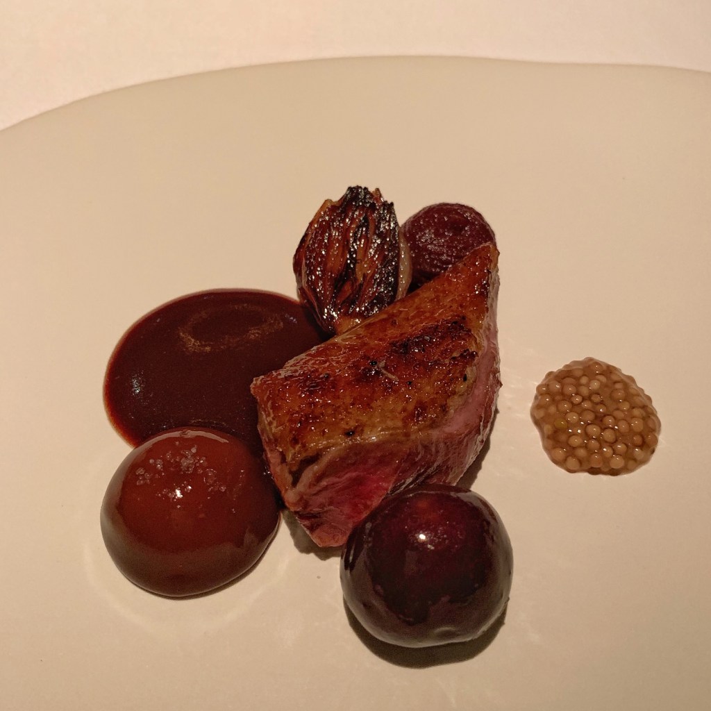 Course VII: Succulent and delicious squab accompanied by caramelized shallots and a sauce made from a reduction of cherry and cabbage puree. The dollop of pickled mustard on the plate was an unexpected but welcome surprise. I loved the piquant characteristic it added to the barbecued pigeon.