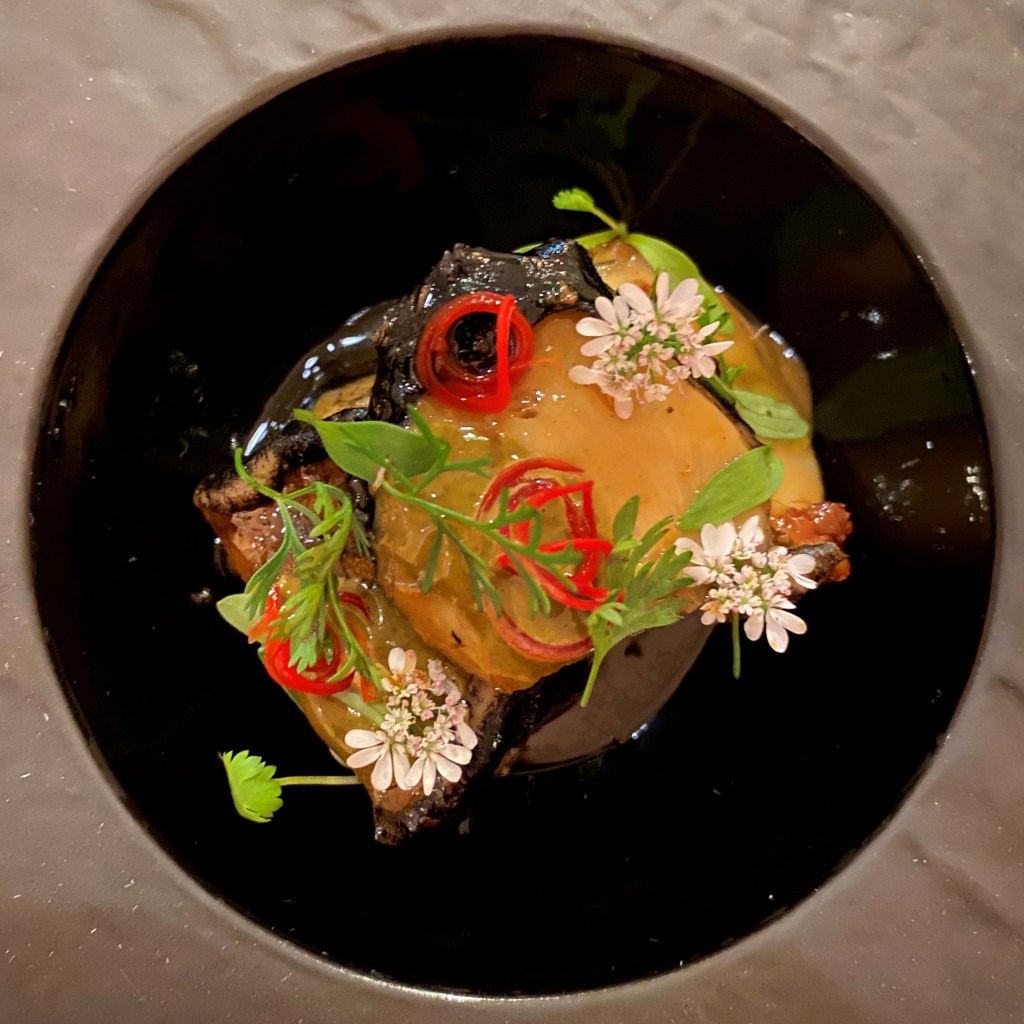 Course 5: The famous three-cup chicken dish (san bei ji) is an iconic Taiwanese recipe made with soy sauce, sesame oil, and rice wine in equal ratios. The substitution of abalone elevated a common Chinese dish to fine-dining status and provided a different texture as well. The abalone meat, tender from a long braise on a low simmer, was highlighted by a sauce made from the liver of the mollusk and kelp broth. A topping of basil and cilantro completed the dish. A classic made classy and elegant…and impresses!