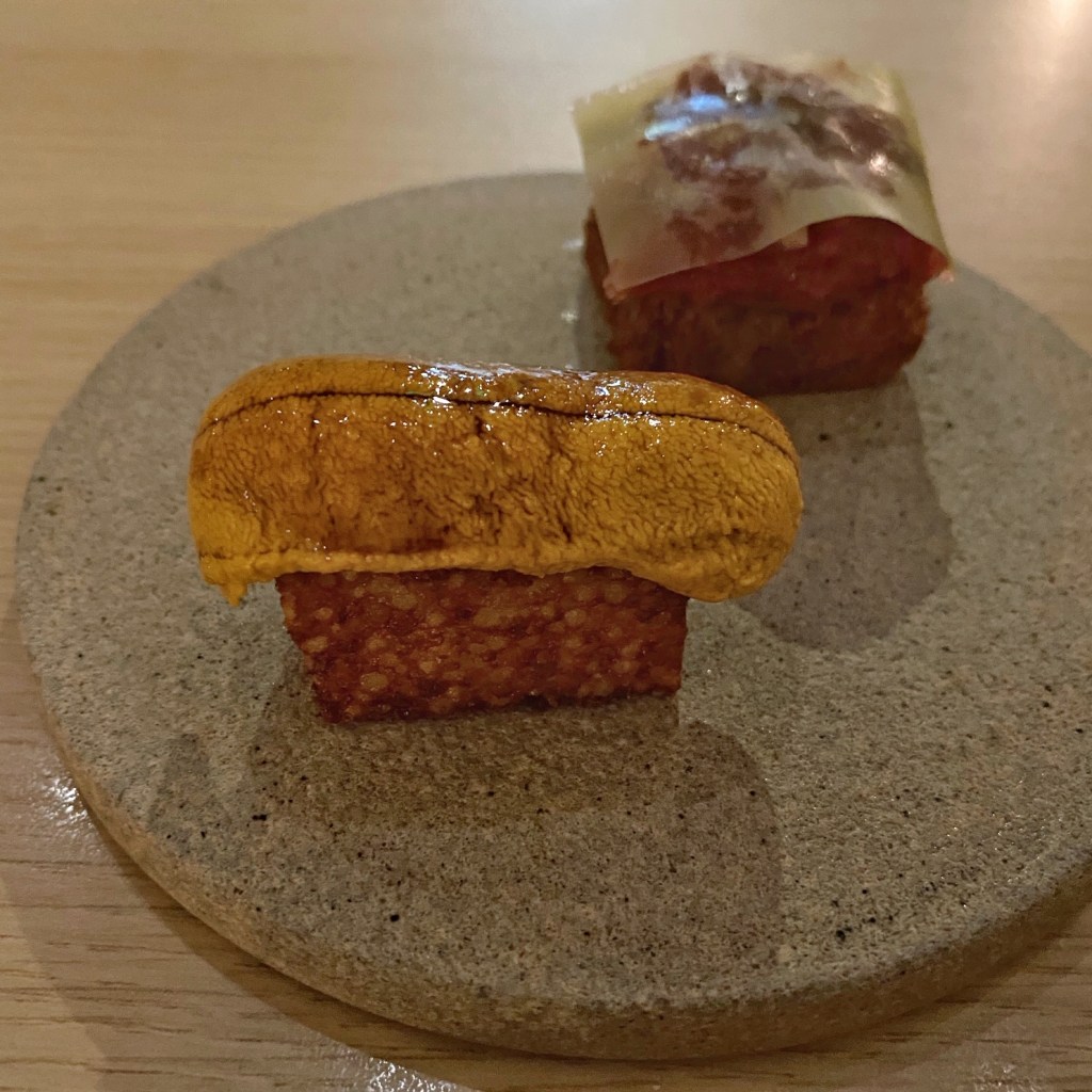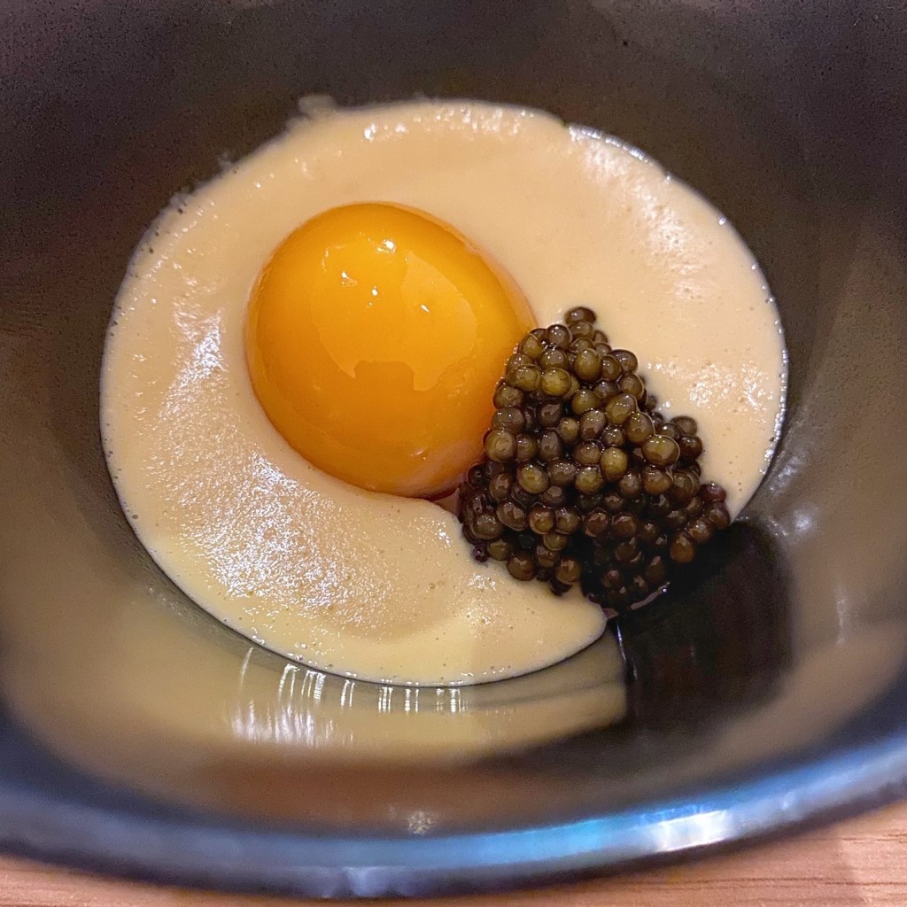 Opening Bites: Three delicious snacks opened the tasting menu. The tapioca bite topped with sea urchin reminded me of Saison’s famous uni toast with its contrasting temperatures and textures. This version is Chef’s homage. Years ago when Jon Yao was staging in San Francisco, he ate at Saison one fateful evening. He found the meal so revelatory that it cemented his desire to pursue cooking professionally.