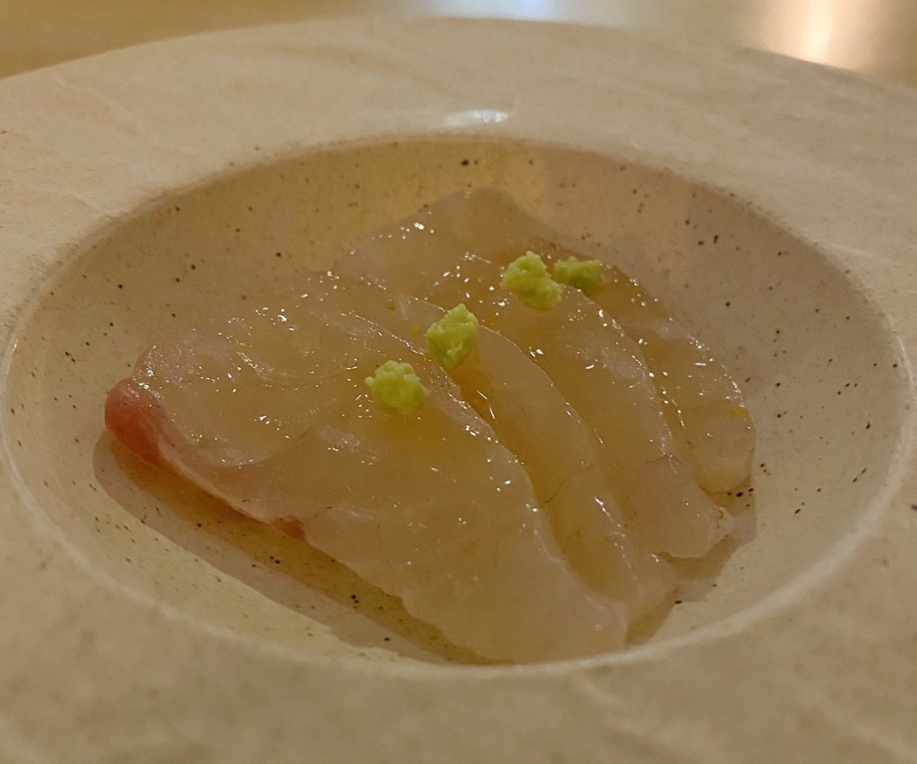 Course 1: Japanese seafood paired with California citrus (Meyer lemon, sudachi, and yuzu). The fish was first cured in salt and then a second time in kombu before being brushed with Meyer lemon to produce a dish with very clean and pure flavors. The final touch was a morsel of freshly grated wasabi placed on top. A reverence for Japanese fish is one of the hallmarks of Kato’s cuisine and exemplifies the restaurant’s focus on aquatic-based proteins. Chef believes seafood is generally so flavorful already that very little alterations are needed, if at all.