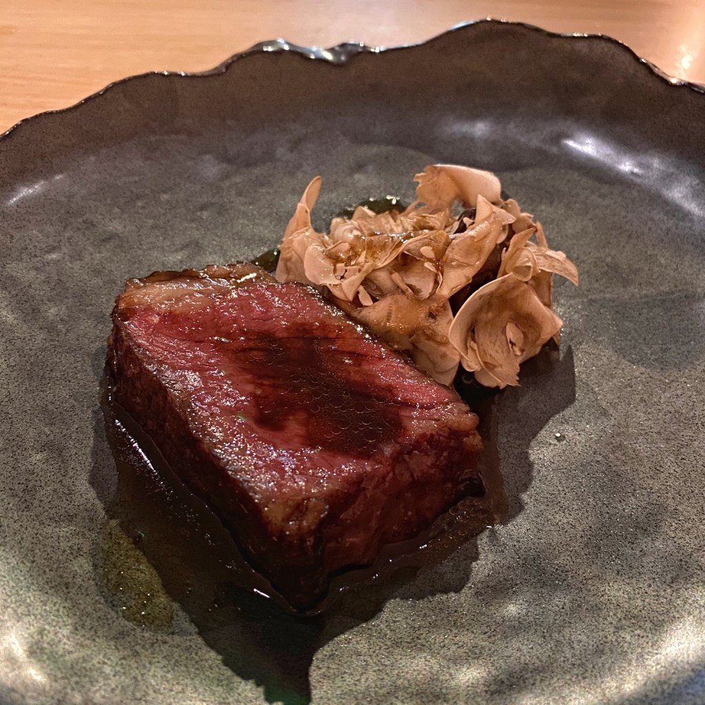 Course 7: NY Wagyu strip grilled on red-hot binchotan charcoal, then placed on top of Tokyo negi, and capped by shiitake mushrooms. The succulent meat was drizzled with a red-braised oxtail jus (containing soy and sugar) accented with black pepper. This is Chef Yao’s fine-dining interpretation of a sizzling steak dish often served in the Chinese and Cantonese cafes he frequented growing up. It is another play on Asian-American food memories but with higher-quality ingredients. It was a very savory dish comprised of several layers of umami.