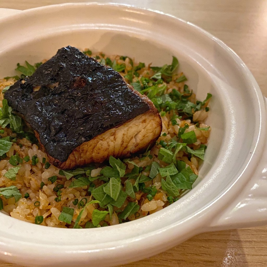 Course 8: Soy-marinated sablefish grilled on binchotan and served on a bed of expertly cooked, Shacha-seasoned rice. Shacha is a Chinese condiment made with soybean oil, garlic, shallots, chile, and dried shrimp. It imparts a very pleasing and savory, though slightly, spicy kick to any dish.