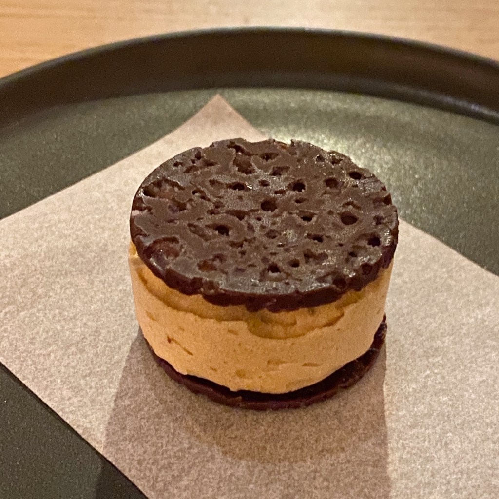 Course 11: The final dessert was made with jasmine-flavored ice cream sandwiched between two home-made tuiles and filled with sweet koji caramel. Eating this was utterly delightful!