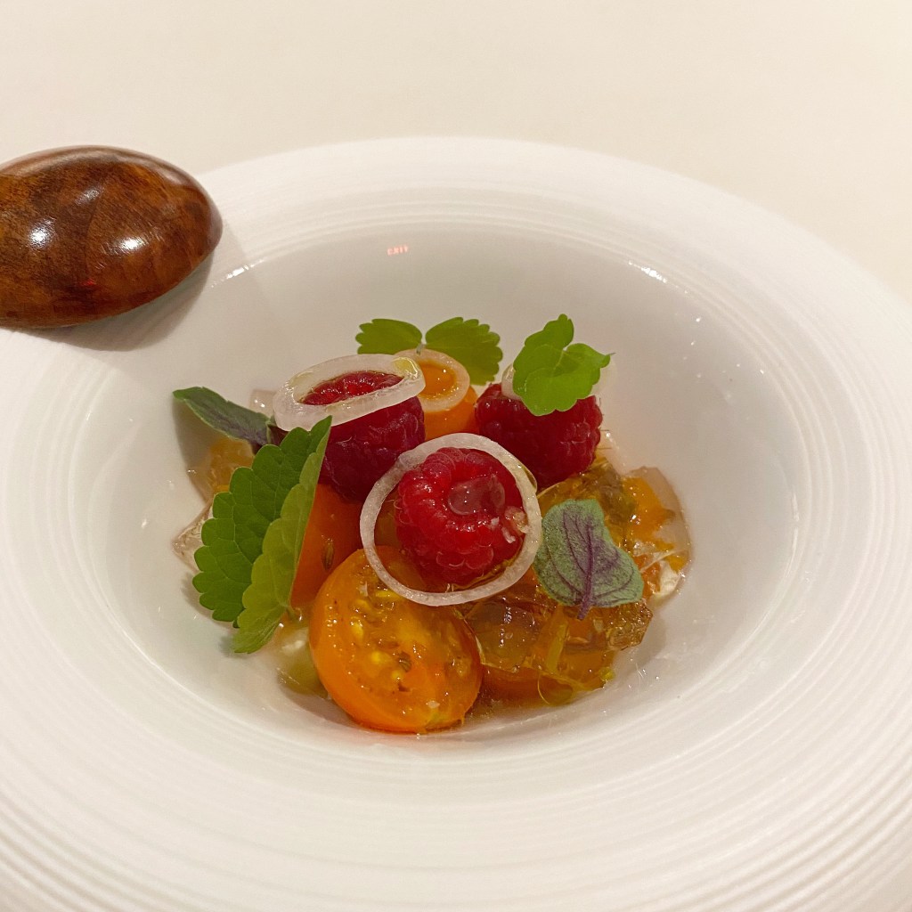 Tomatoes tend to be the reigning fruits used as vegetables to highlight the summer season. At Jônt, the “Tomato” dish consisted of raspberries and verbena jelly placed on top of a small mound of fresh cow’s milk cheese. The flavorful Sungolds were tempered by the subtle sweetness of the aggregate berry, and together, both complemented the mild cheese. But the surprise was the jelly which strongly held the concentrated essence of the verbena, a somewhat spicy aftertaste I had first mistaken for ginger. For the two previous times I ate this particular dish, the other ingredients had overshadowed the soupçon of verbena, concealing it completely. I only noticed the full brunt of its flavor after trying the jelly separately. Even for someone who lacks patience with the turgid DC heat, the bright, acidic bites of these delicious tomatoes had me longing for the persistence of summer just to continue eating this course over and over.