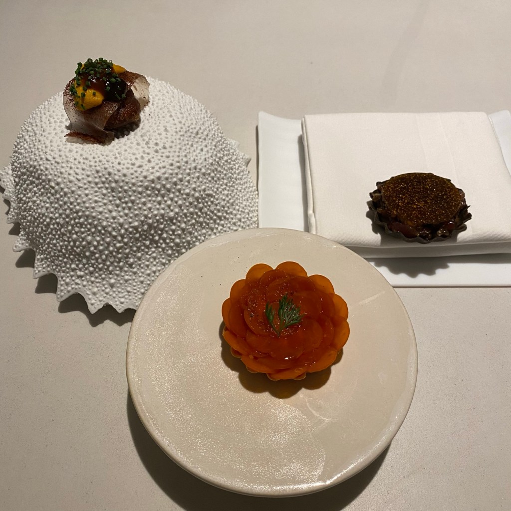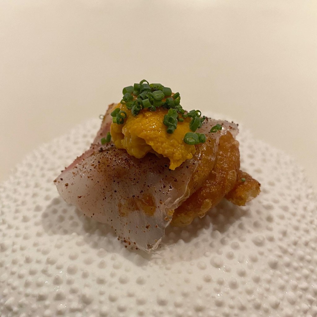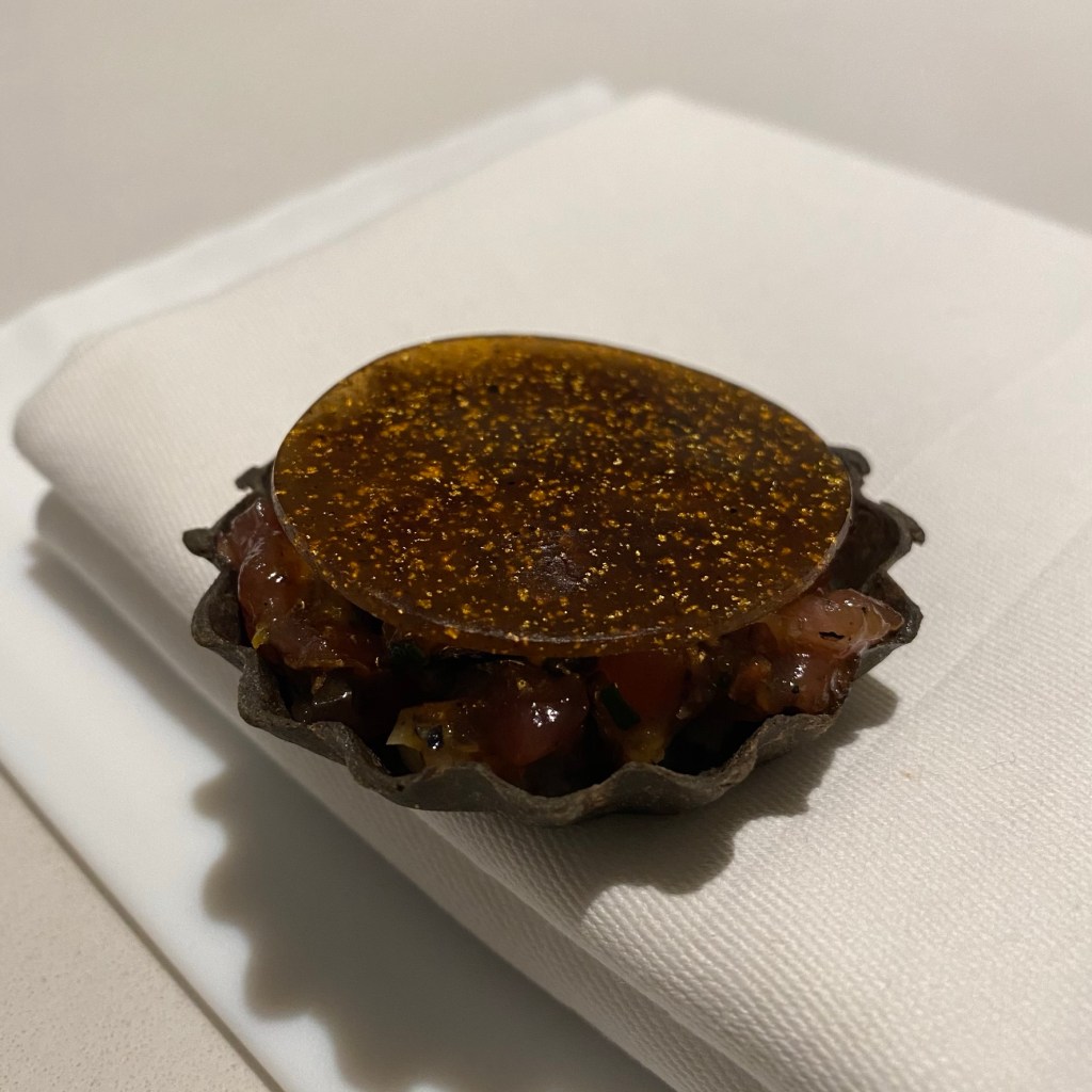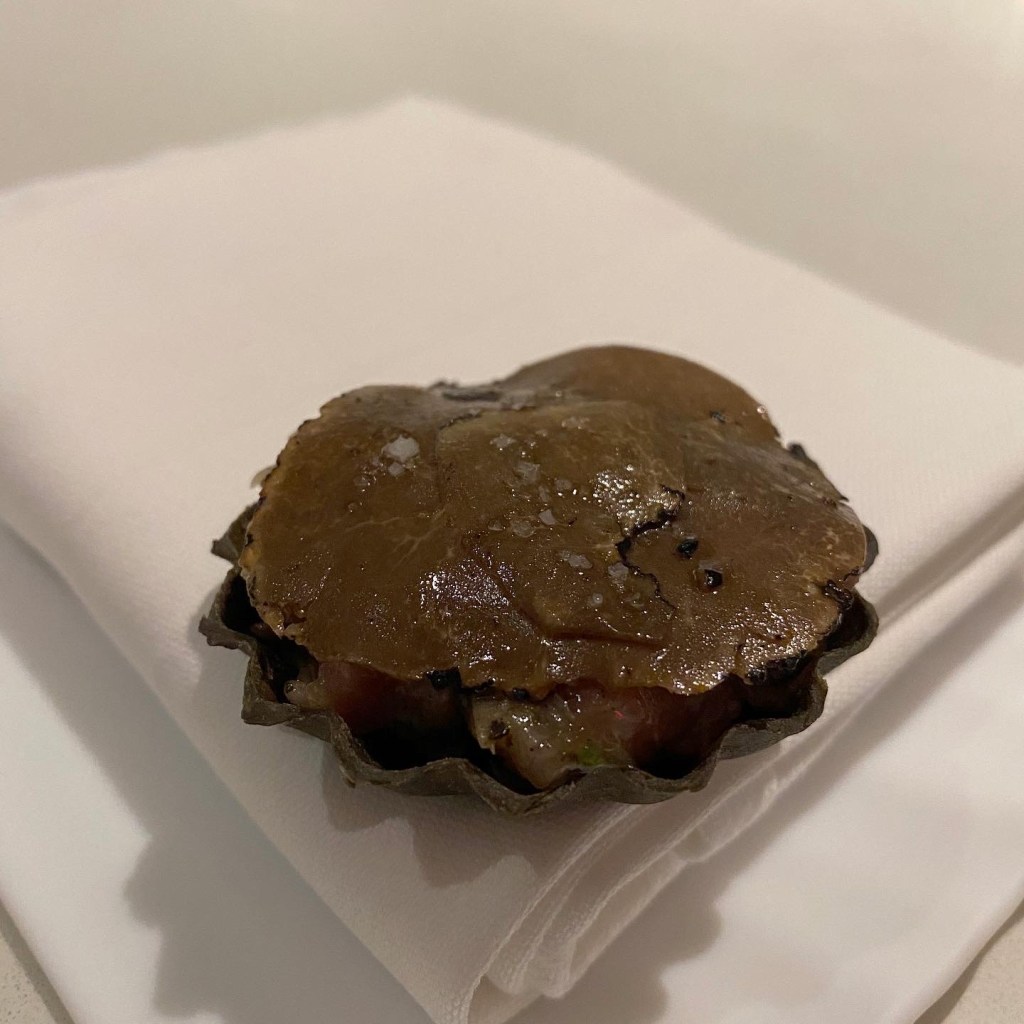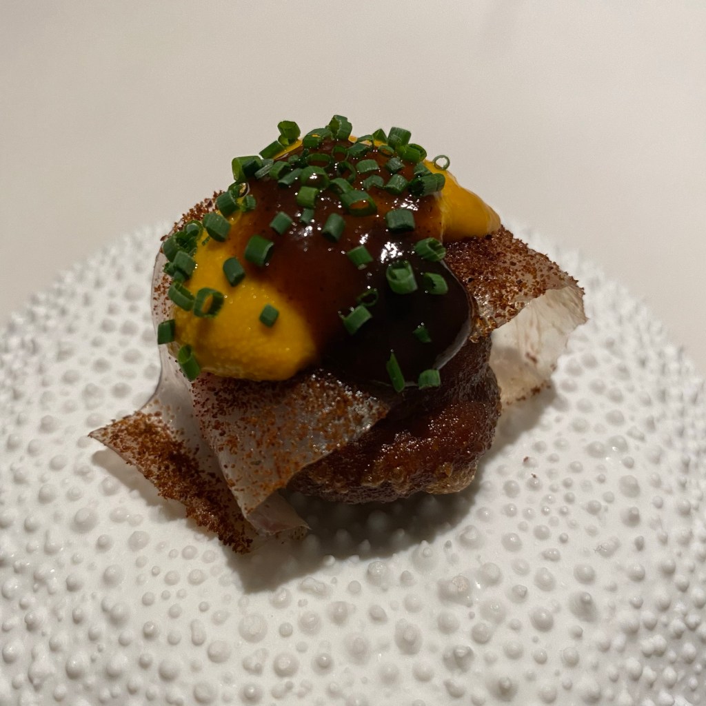 The second canapé was deep-fried choux pastry topped by a diaphanous slice of guanciale, a fatty charcuterie made from pork jowl. The guanciale had a glossy sheen that telegraphed its unctuous profile. Japanese uni was crowned on top and finished with barley koji, a mold used to ferment certain staples like rice and soybeans. The creaminess of the oceanic uni melded very well with the sliver of guanciale and the “donut”. It left a lovely fattiness on my tongue with a very satisfying mouthfeel.