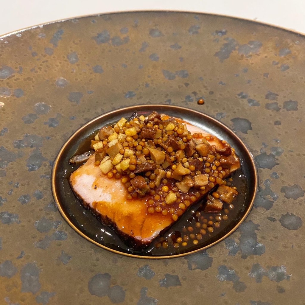 The fish and meat-based dishes that came next allowed the kitchen to showcase one of their many fortes: sauces. Over multiple meals, every sauce served to date has been appropriately balanced, nuanced, and seasoned to deliver maximum flavor. Amazing sauces are one key reason the cuisine is spectacular here. At Jônt, they are the equivalent of liquid finesse, never too strong as to overpower ingredients on the plate or too subtle as to question its necessity. Each sauce has elevated the cuisson of the accompanying protein regardless of whether it was beef from dairy cows, heritage pork, Japanese and Spanish fish, or aged duck. In short, every meat dish accompanied by sauce has been precisely calibrated with superb technical proficiency.