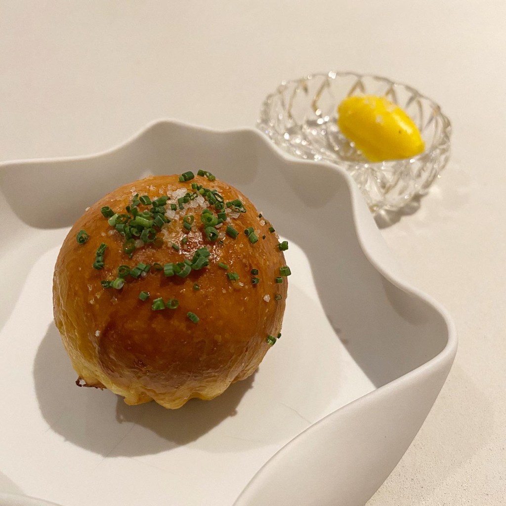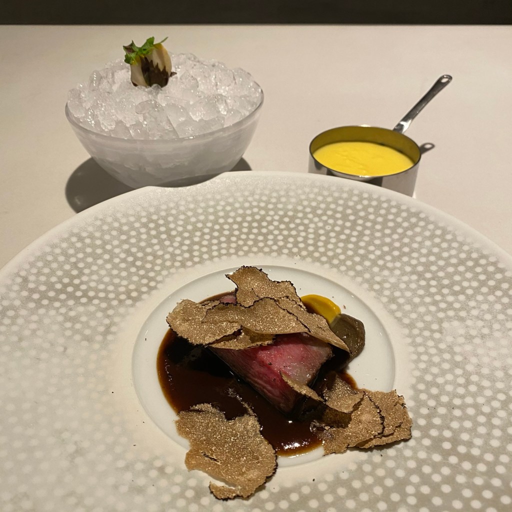 During the first iteration of the fall menu, I repeated the same bread-mopping process when presented with an excellent A5 Wagyu sourced from the Iwate prefecture in Japan. The course arrived with a Perigourdine sauce ornamented with freshly shaved truffles. The heady sauce is named for its origin in Périgueux, a French city in the Périgord region famous for its truffles. The traditional recipe calls for demi-glace, Madeira wine, butter, truffle essence, and salt and pepper for seasoning. An intensely marbled meat like A5, when paired with creamy Robuchon potatoes loaded with butter, and served with a brioche with a quenelle of whipped butter might seem like sensory overload. Thankfully, and thoughtfully, a slice of lacto-fermented kohlrabi was offered alongside the course to cut through the delicious unctuousness and provide balance to the palate.