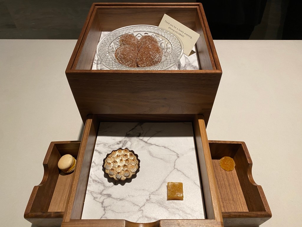 Some enhancements have occurred in the service such as offering a second compressed towel tablet, the kind that expands and unfurls itself when water is added, to refresh the hands after canapés are served. If a guest leaves mid-meal to use the restroom, their napkin is not refolded but replaced with a new one instead. At my most recent visit, I was provided a hot green tea and complimentary madeleines to-go before exiting the restaurant. I certainly appreciated this kind gesture that extended their hospitality beyond the end of the meal.